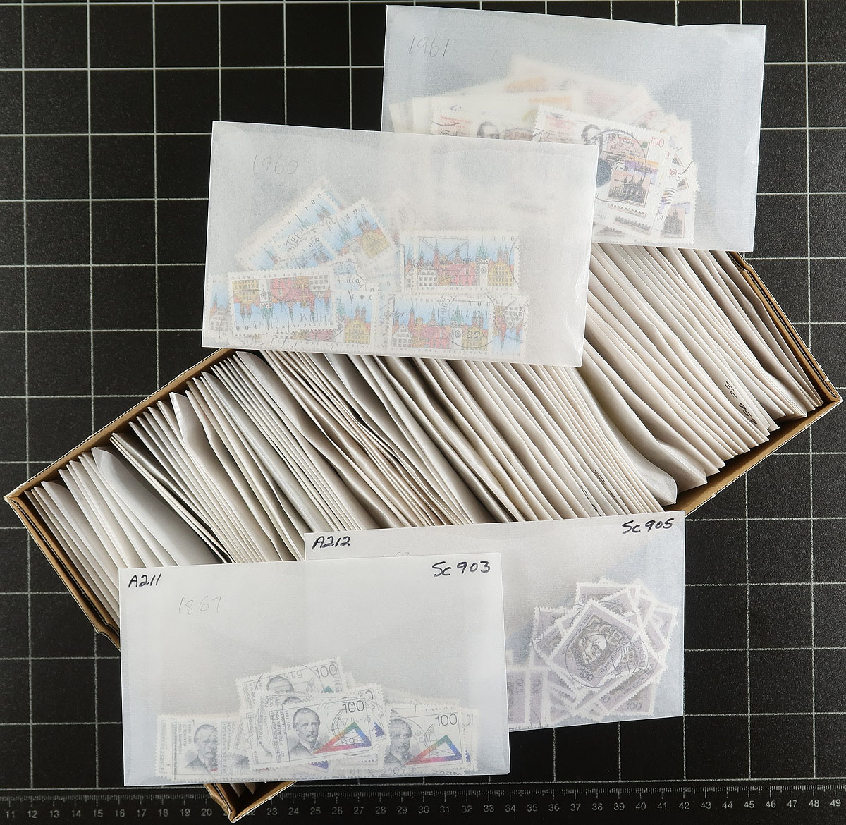 Super used holding Part F (#1736/2105). This section runs 1992 - 2000. While most are relatively common, but there will be substantial numbers cataloguing $1.50-$5.00 each (such as the "Historical Sites" series). All are sorted individually into #5 sized glassine envelopes and marked with the Scott number. This collector excluded damaged stamps and had a fondness for readable cancels and there are hundreds (if not more). Thousands of off-paper stamps, filling FOUR shoeboxes. Estimate =