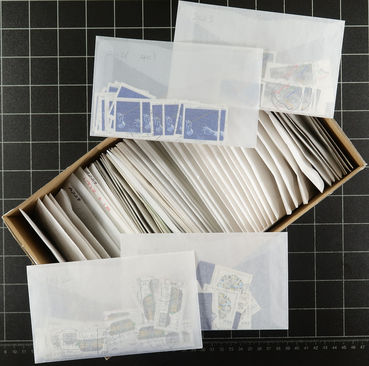 Super used holding Part F (#1736/2105). This section runs 1992 - 2000. While most are relatively common, but there will be substantial numbers cataloguing $1.50-$5.00 each (such as the "Historical Sites" series). All are sorted individually into #5 sized glassine envelopes and marked with the Scott number. This collector excluded damaged stamps and had a fondness for readable cancels and there are hundreds (if not more). Thousands of off-paper stamps, filling FOUR shoeboxes. Estimate =