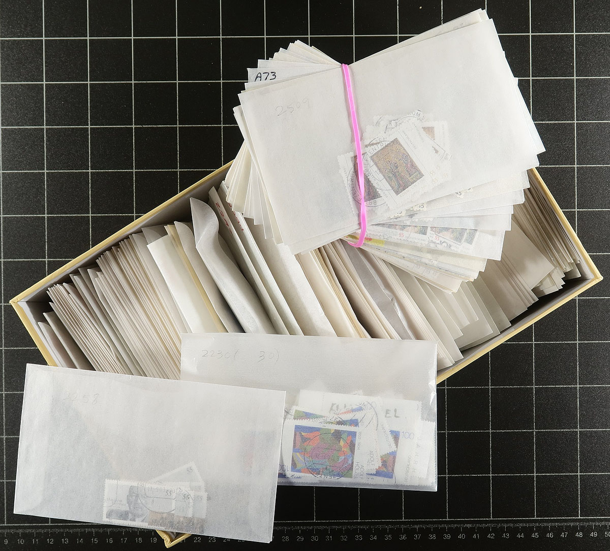 Super used holding Part G (#2106/2716). This section mostly covers 2001 to 2008 (and a bit later to 2013), with the transition from Mark to Euro. This starts the period where postal usage started to drop substantially and nicely used material gets harder to find. Much of the "common" material from this period catalogues $0.75-$3.00 a stamp (and there are thousands of them, here). All are sorted individually into #5 sized glassine envelopes and marked with the Scott number. This collector excluded damaged stamps and had a fondness for readable cancels and there are hundreds (if not more). Thousands of off-paper stamps, filling THREE shoeboxes. Estimate =