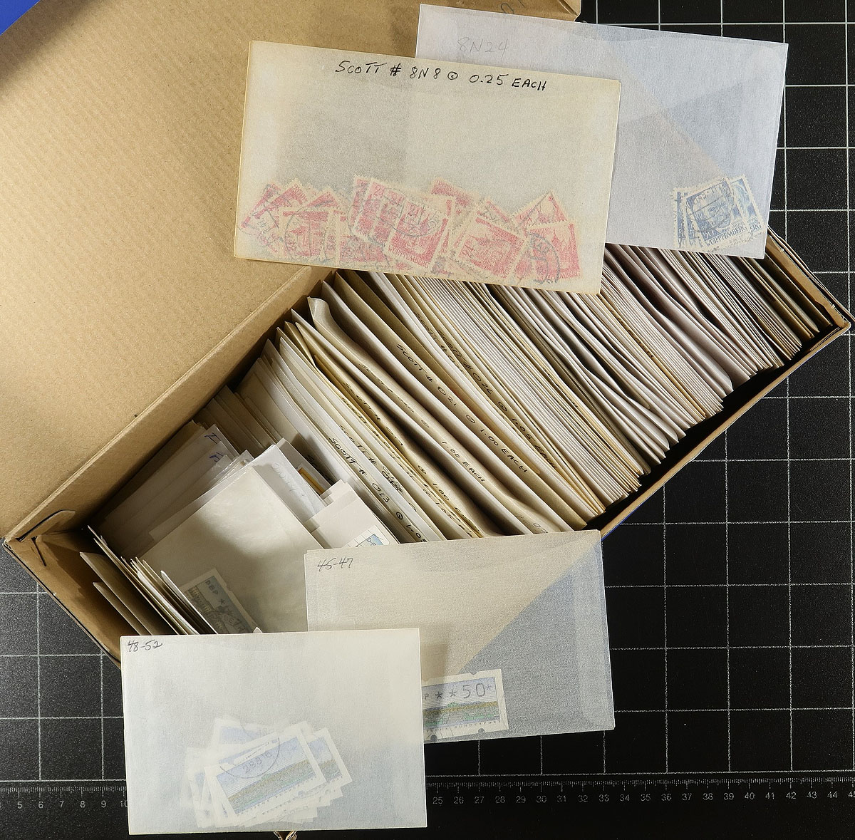 Super used holding Part J (#C46/C64, MC1, O2/O98, OL4/OL15, S2/S9, 3N2/3N13a, 4N2/4N9). This "back of the book" includes airmails, lots of officials, local post, franchise stamps and some occupation issues including Allied Military Government. Bonus material is a small group of "Vending" machine stamps - listed in Michel but not Scott. While most of the material is relatively common, much of this material is better used than mint. All are sorted individually into #5 sized glassine envelopes and marked with the Scott number (if there are catalogue prices, they are quite old). This collector excluded damaged stamps and had a fondness for readable cancels and there are hundreds (if not more). A couple of thousand off-paper stamps, filling a shoebox. Estimate =