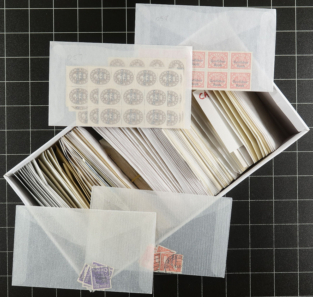 Super mint and used holding Part L: A bit of a catch-all, from the last group of this massive holding. The DDR includes better used individual items such as #48, 56, 57, and there is a small group of mid-period complete booklets, and a bit of back of the book. The Bavaria includes a varied mix of regular and official items (both mint and used), with individual catalogue values up to $6.00. All are sorted individually into #5 sized glassine envelopes and marked with the Scott number (if there are catalogue prices, they are quite old). This collector excluded damaged stamps and had a fondness for readable cancels and there are hundreds (if not more). A couple of thousand off-paper stamps, filling a shoebox. Estimate =