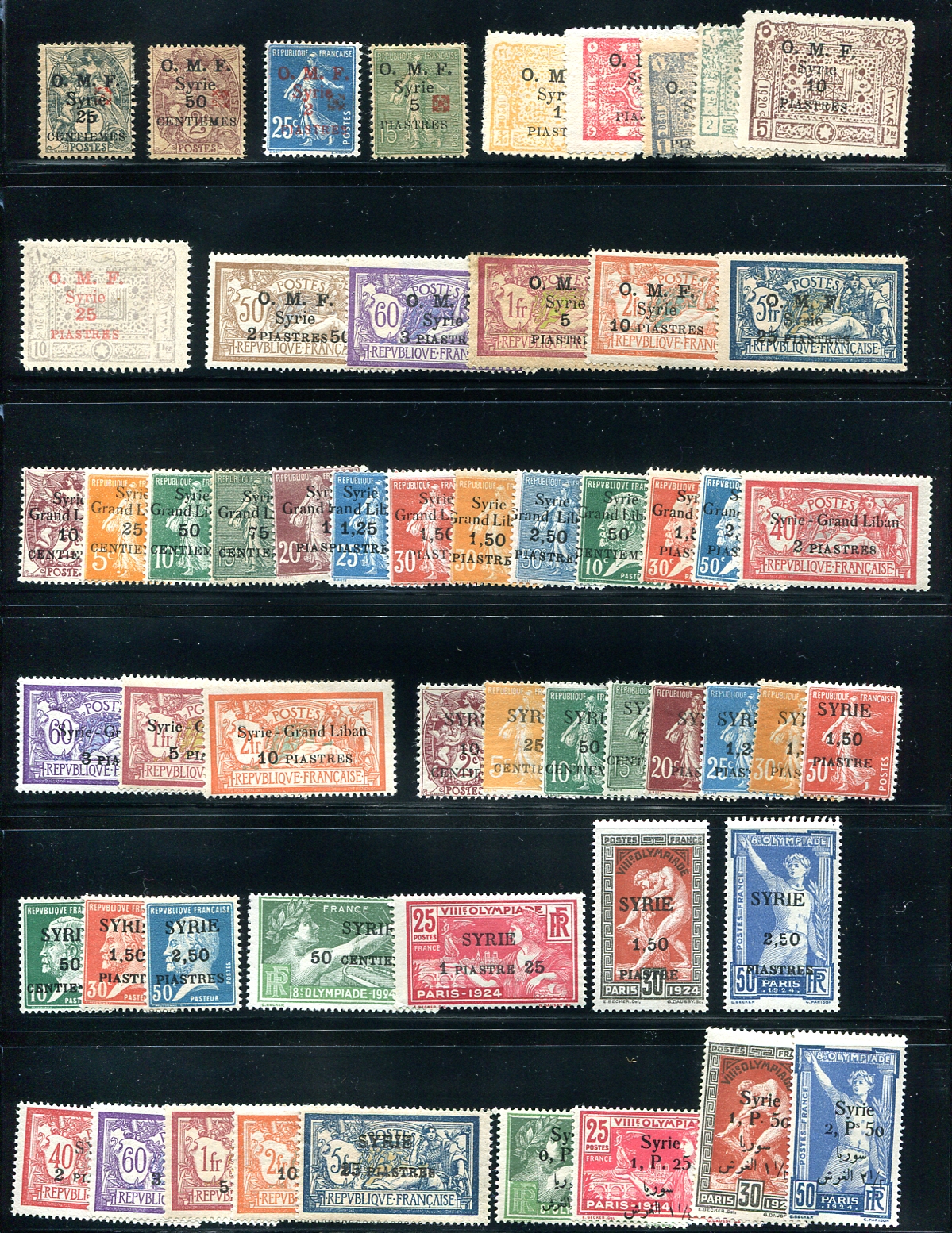 Attractive mint selection of overprints on during the French administration, in several different styles and both overprints of the 1924 Olympics. While some of the earlier definitives appear to be toned, this isn’t due to mishandling as these were the French wartime printings on low quality paper, which were subsequently doled out for use in "the Colonies". All are Hinged, but many quite lightly. A great start on a technical collecting area. 2024 Scott US$723.75 =