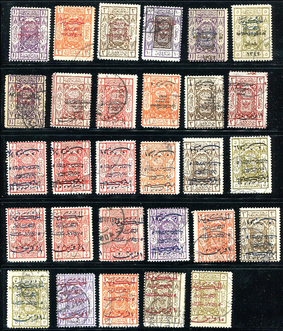 A page with 29 different used "Arms of Sherif of Mecca" design with various overprints and revaluations. Includes #L119, L122, L130, L135, L149-L159. Many nice cancels. The L107 is cancelled to order. The others all look good, and we invite you bring a critical eye to these complex issues. 2024 Scott US$1,119.75 =