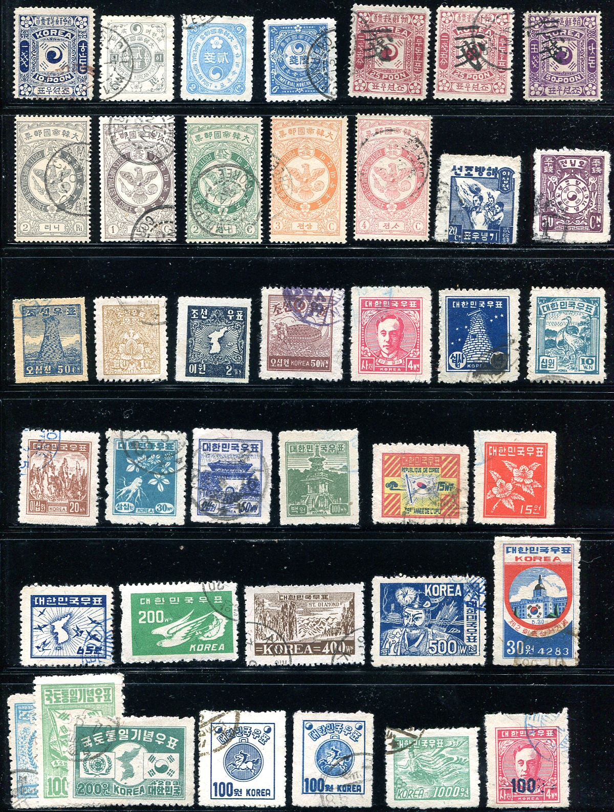 Two pages of early used Korea from the emergence in 1895 until just after the War of 1950-1953. Includes a few better singles, including 1902 overprints, 5 different "Falcons", ten different examples from the "Participants" series, including one from India. Little bit of mixed condition, but overall, very clean. 2024 Scott US$501.20 =