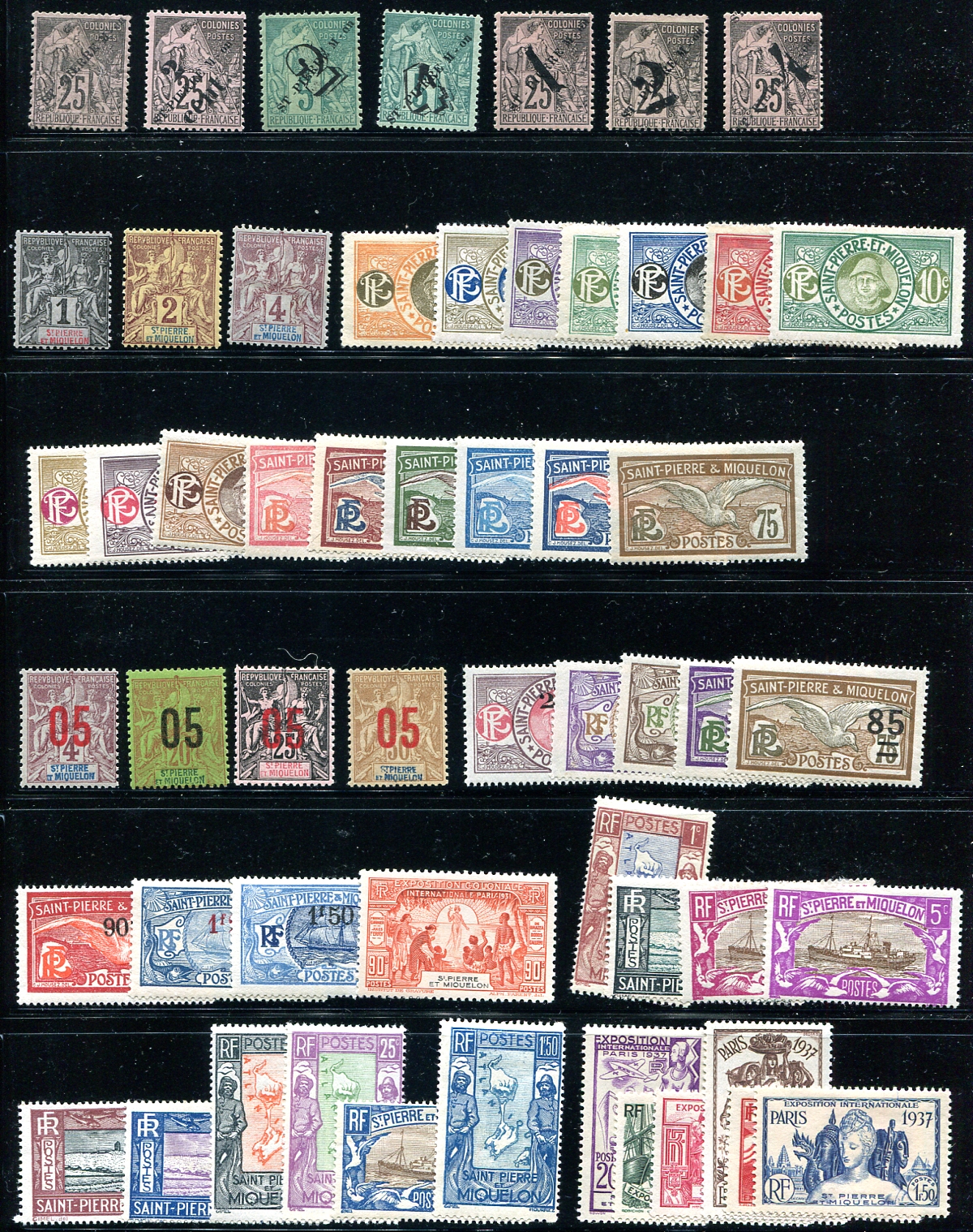 Two pages of a "sampler" of mint SPM from the French Colonial overprints, and an assortment of "Fishermen", "Seagulls", "Ships", "Dogs", with the best being ten different "FNFL" (Free French) overprints (a few with Bileski marks). A wide range of hinging, with a number being never hinged or lightly hinged, and only a few with heavy hinging or small remnants. Very fresh appearance. 2024 Scott US$574.90 =