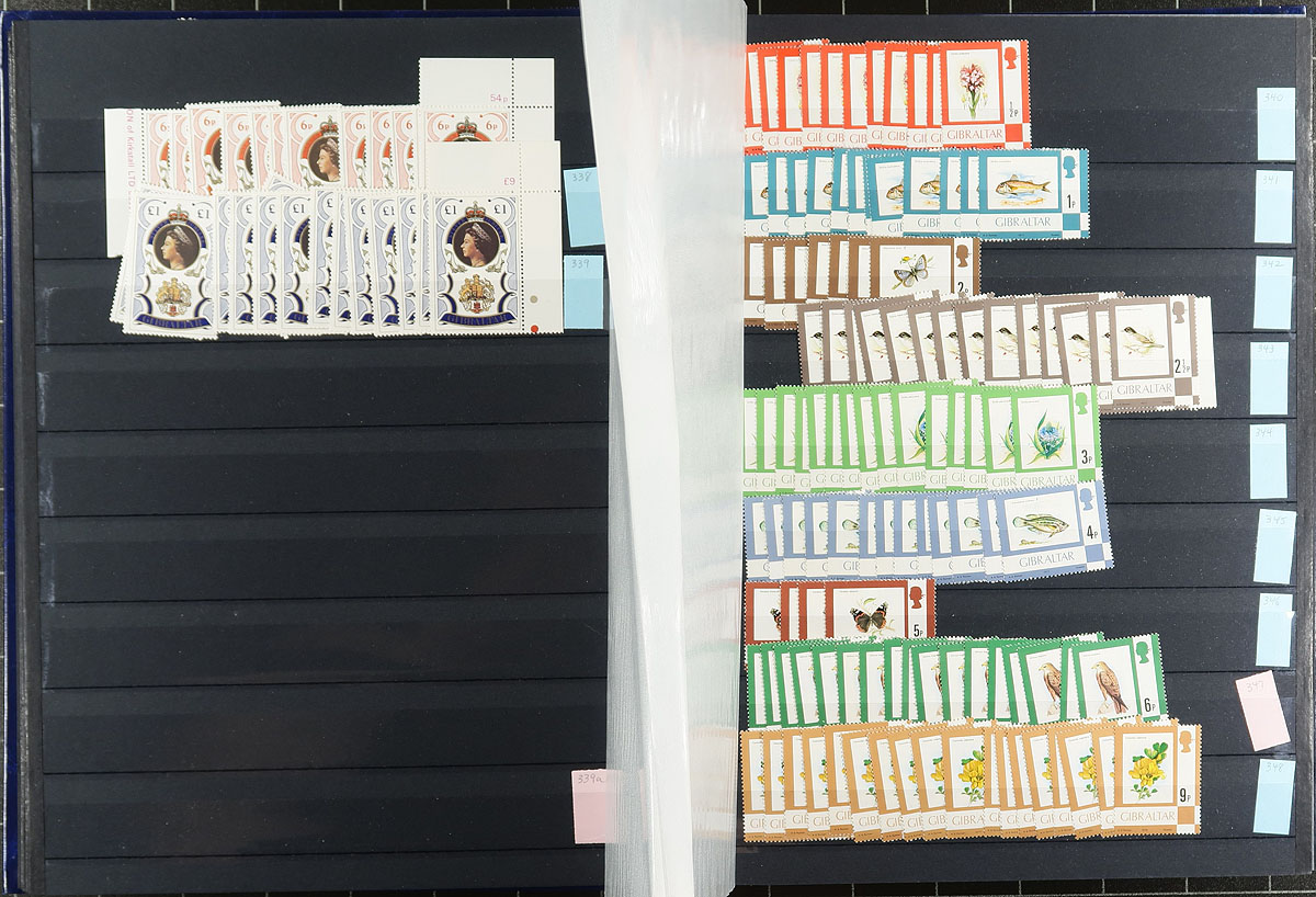 Mint accumulation Part A: One collector’s duplicates covering 1971-1989, and what a group it is. Housed in a near-new 64-black page Lighthouse stockbook, each stamp is identified with its Scott number. This is a very complete run, but lots of space has been left to allow the stamps to breathe. Up to 15 of a type, all appear to be never hinged. Notable examples include #272a (8 pairs), #354-355A (at least 12 each, face value over £100), #416-430 (5 sets), #508-520 (8 sets). Plus, there is lots of topical appeal including military, animals, flowers, airplanes, etc. The bonus item is a binder of 1970-76 "Military Uniforms", a group of 22 sheetlets which the owner catalogued at US$579.25 by Scott 2021 and even though they are on "magnetic" photo pages, the items are backed with a paper insert and mounted at the corners, a quick check indicates that they will emerge completely unscathed. Estimate =