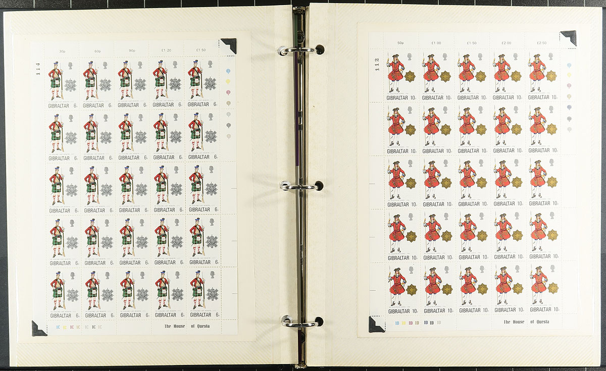 Mint accumulation Part A: One collector’s duplicates covering 1971-1989, and what a group it is. Housed in a near-new 64-black page Lighthouse stockbook, each stamp is identified with its Scott number. This is a very complete run, but lots of space has been left to allow the stamps to breathe. Up to 15 of a type, all appear to be never hinged. Notable examples include #272a (8 pairs), #354-355A (at least 12 each, face value over £100), #416-430 (5 sets), #508-520 (8 sets). Plus, there is lots of topical appeal including military, animals, flowers, airplanes, etc. The bonus item is a binder of 1970-76 "Military Uniforms", a group of 22 sheetlets which the owner catalogued at US$579.25 by Scott 2021 and even though they are on "magnetic" photo pages, the items are backed with a paper insert and mounted at the corners, a quick check indicates that they will emerge completely unscathed. Estimate =