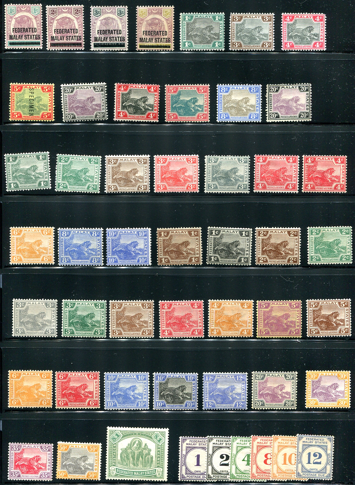 A very attractive page of Tigers, Elephants and postage dues (oh my!). Very fresh appearance with no visible faults and denominations to $1.00. Includes a couple of die types. Hinging varies, from very light to small hinge remnants. A bonus is #21 the 5c (first stamp on row two), which is overprinted "Specimen" but counted as a regular stamp. 2024 Scott US$412.85 =