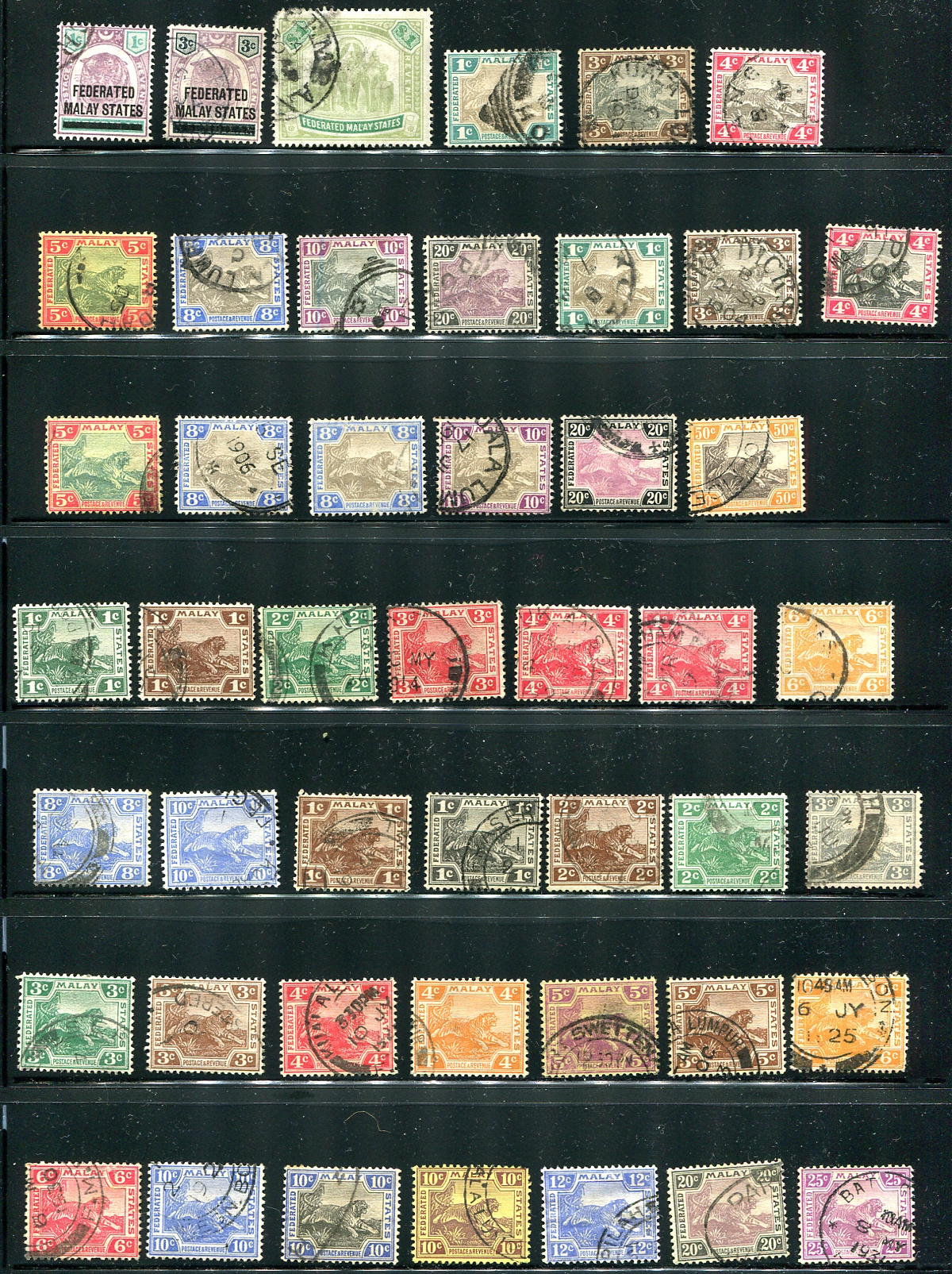 Postally used group of Tigers and Elephant issues from the forerunner of Malaysia, with a number of readable cancels from smaller towns. Better singles include #14 and #73 and a nice group of postage dues. Better condition than normally seen, and only a few minor faults are to be expected. 2024 Scott US$694.95 =