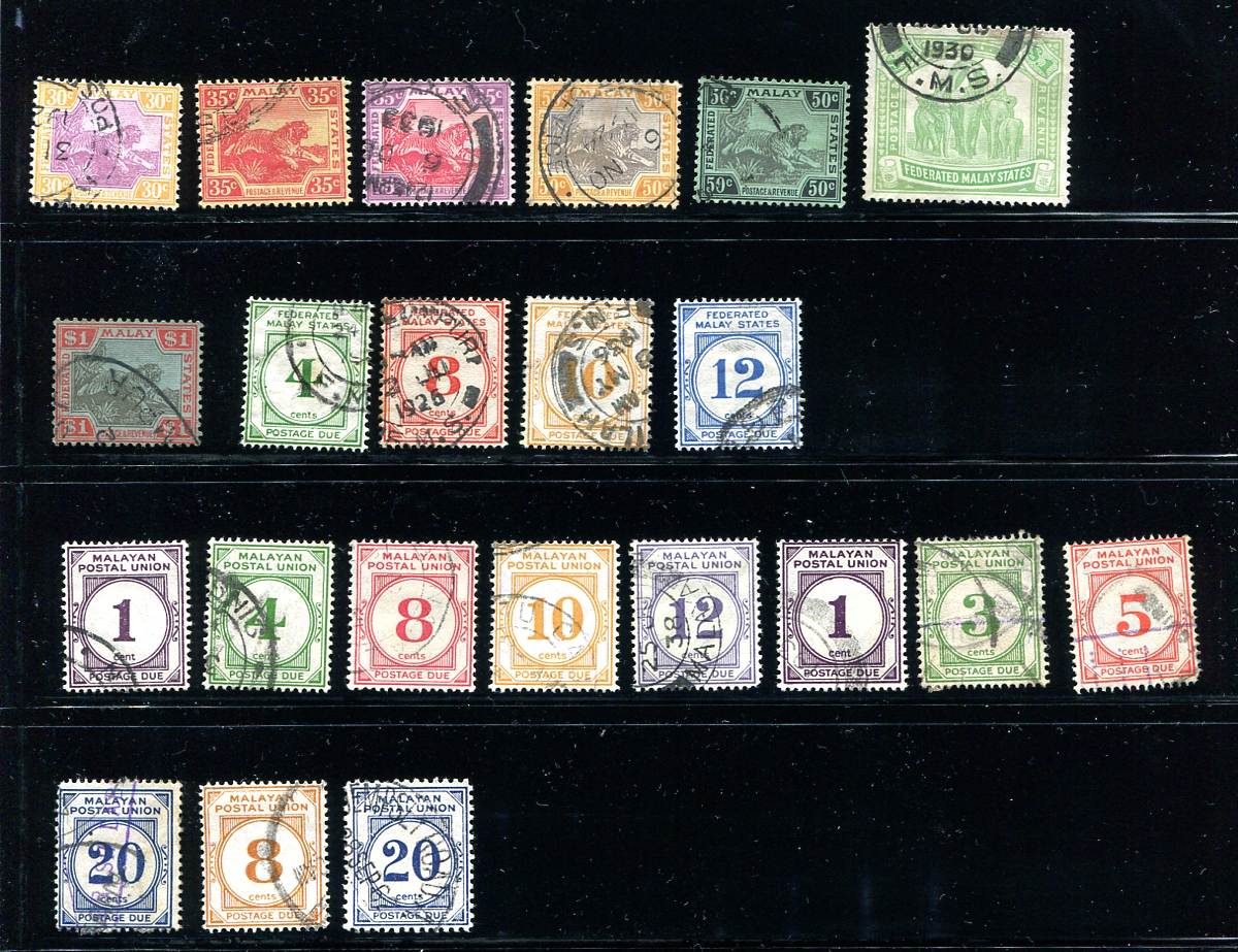 Postally used group of Tigers and Elephant issues from the forerunner of Malaysia, with a number of readable cancels from smaller towns. Better singles include #14 and #73 and a nice group of postage dues. Better condition than normally seen, and only a few minor faults are to be expected. 2024 Scott US$694.95 =