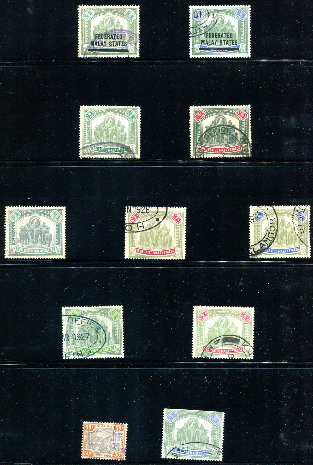 Group of 10 elephants and a Tiger. Higher value stamps each with a revenue cancel. Includes #11, 13-15, 25b, 34-36, 73. The #16 has been trimmed at the top and is not counted. Some stamps have been priced as revenue cancels, where listed by Scott, the rest as postal usages. 2024 Scott US$1192.50 =