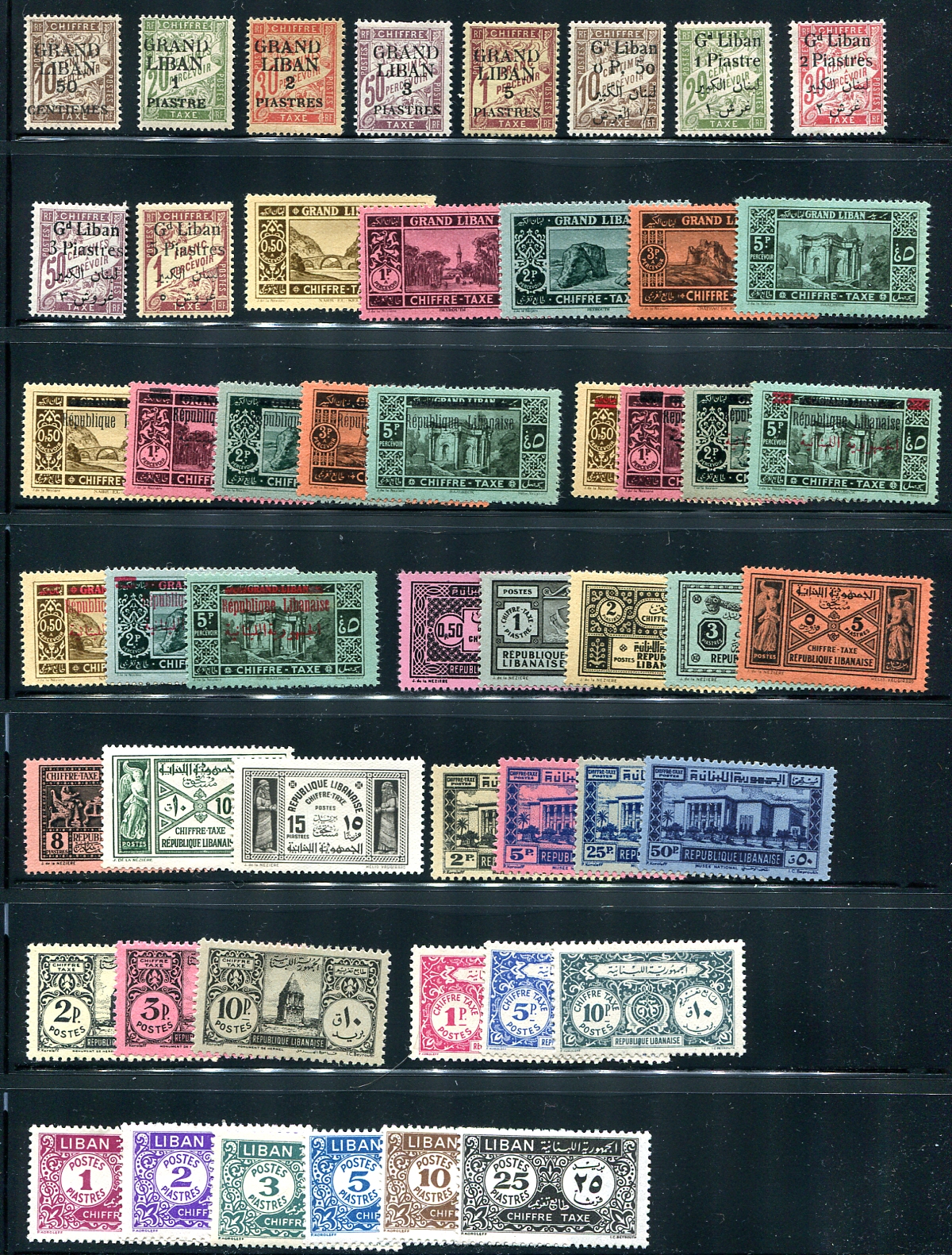 The complete Scott listings of Lebanese postage dues, missing only #J24, #J41-J43 all mint and mostly lightly hinged. Starts with overprints on French postage due stamps and running up to 1968 when these stamps were discontinued. Fresh, with no obvious faults, and not often seen material. 2024 Scott US$343.50 =
