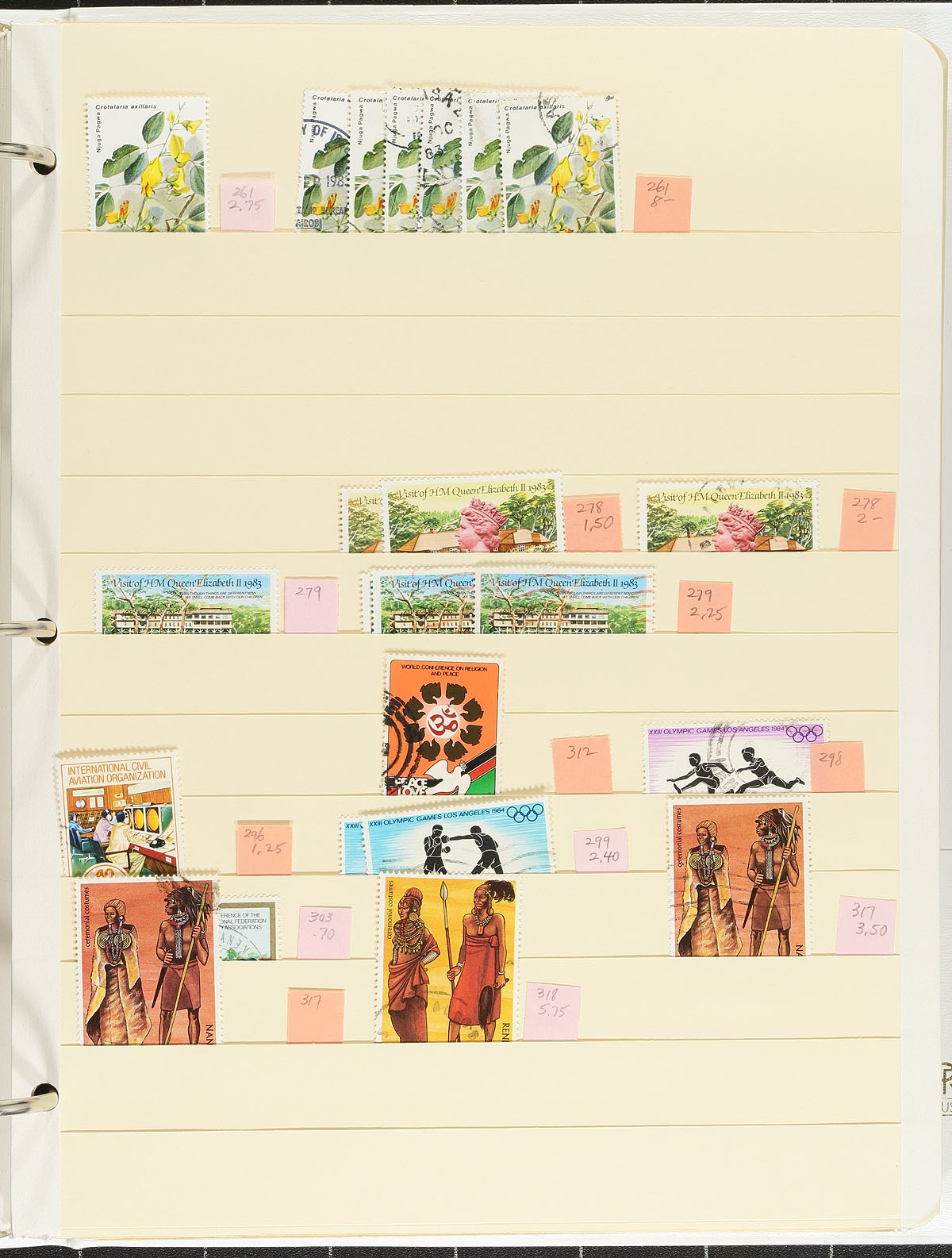 One collector’s accumulation of mint and (mostly) used modern Kenya, up to 2008, with a wide range of issues (noting a number in the $5-$10 range of catalogue values (saw #1-14, #35, #103-104, #112, #261, #352-254, #440, #610) with quantities up to 10 of a type. Lots of great African themes (seashells, birds, flowers, butterflies, etc.). The condition is excellent. Includes some 21st century when Kenya has adopted a minimalist issuance policy. 27 manila stockpages, with each stamp identified by Scott number, and lots of catalogue values, mostly quite current. Estimate =