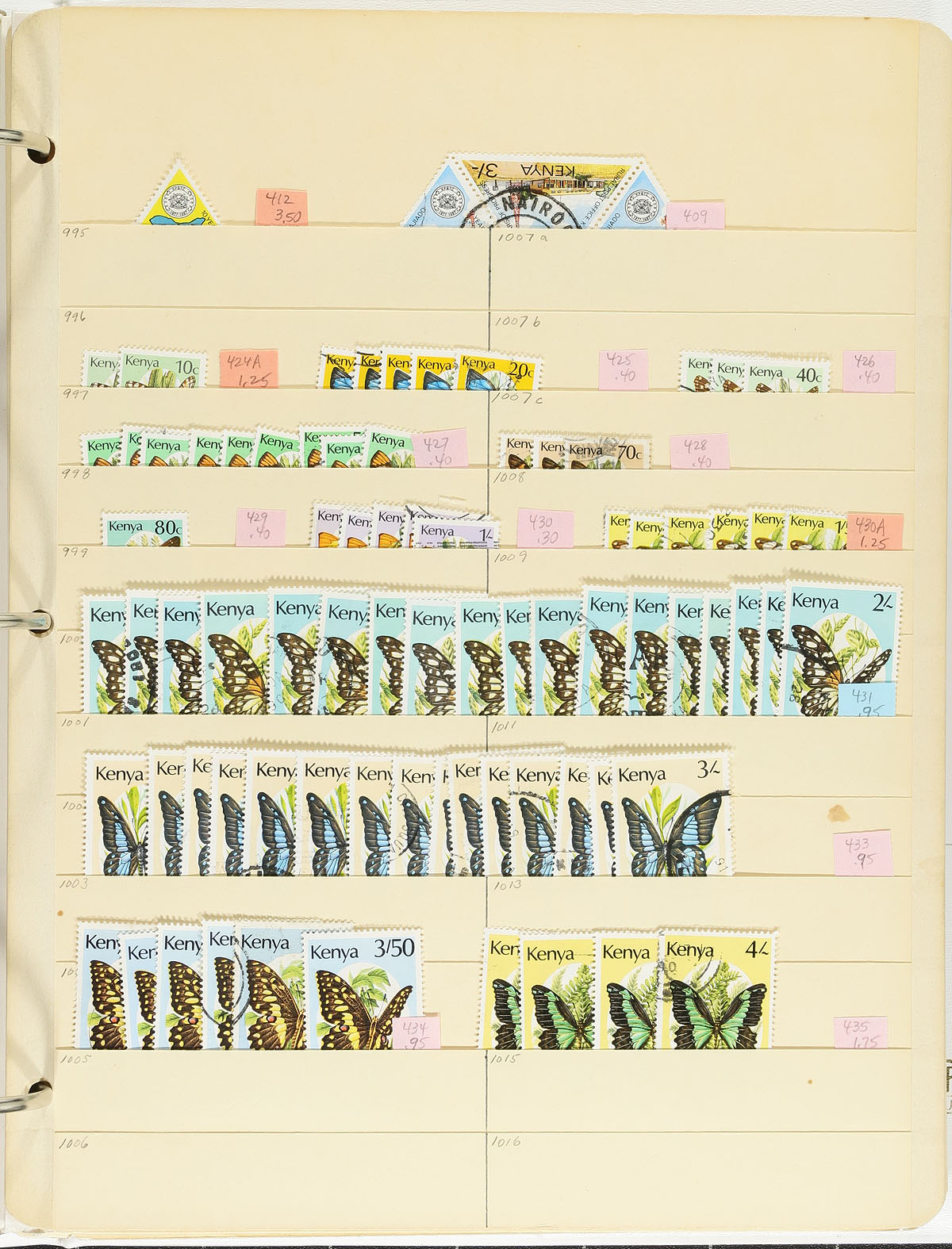 One collector’s accumulation of mint and (mostly) used modern Kenya, up to 2008, with a wide range of issues (noting a number in the $5-$10 range of catalogue values (saw #1-14, #35, #103-104, #112, #261, #352-254, #440, #610) with quantities up to 10 of a type. Lots of great African themes (seashells, birds, flowers, butterflies, etc.). The condition is excellent. Includes some 21st century when Kenya has adopted a minimalist issuance policy. 27 manila stockpages, with each stamp identified by Scott number, and lots of catalogue values, mostly quite current. Estimate =