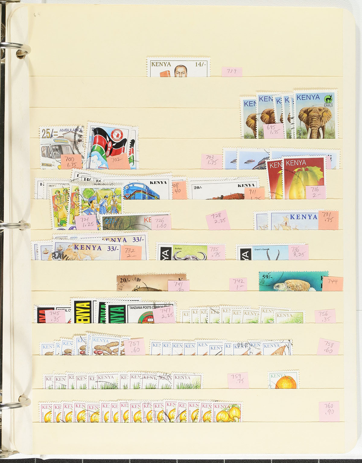 One collector’s accumulation of mint and (mostly) used modern Kenya, up to 2008, with a wide range of issues (noting a number in the $5-$10 range of catalogue values (saw #1-14, #35, #103-104, #112, #261, #352-254, #440, #610) with quantities up to 10 of a type. Lots of great African themes (seashells, birds, flowers, butterflies, etc.). The condition is excellent. Includes some 21st century when Kenya has adopted a minimalist issuance policy. 27 manila stockpages, with each stamp identified by Scott number, and lots of catalogue values, mostly quite current. Estimate =