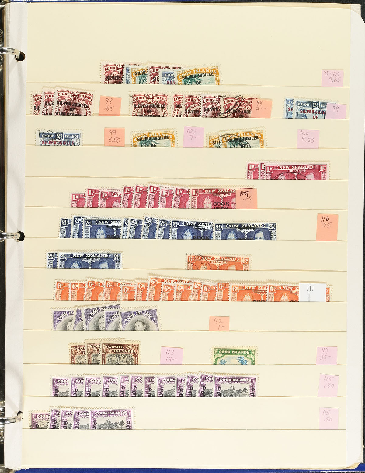 A century-long accumulation of mint and used Cook Islands, from New Zealand administration, through independence and up to the mid-1990s. Nicely displayed on 17 manila stockpages plus the early that are on a black stockpage (to give you a better sense as to what is here). Early include catalogue values to $50.00 and noted later such as #114, #124, #131-140, #148-158, #402. There is a wide range of material, with quantities up to about 5 of a type. Substantial catalogue value here, and of the highest quality. The collector has identified items by Scott, the pricing is over 10 years old but holds up reasonably well. Estímate =