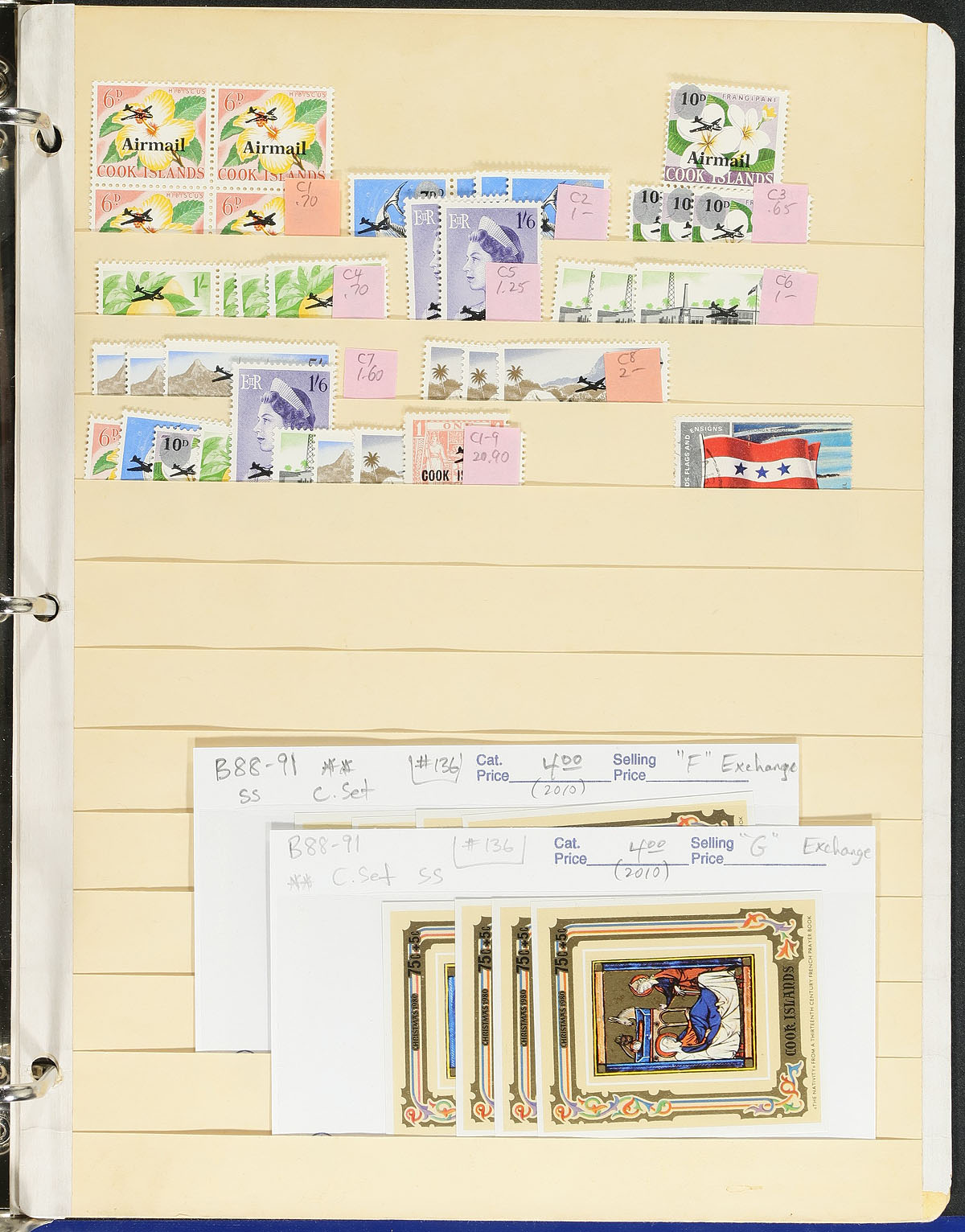 A century-long accumulation of mint and used Cook Islands, from New Zealand administration, through independence and up to the mid-1990s. Nicely displayed on 17 manila stockpages plus the early that are on a black stockpage (to give you a better sense as to what is here). Early include catalogue values to $50.00 and noted later such as #114, #124, #131-140, #148-158, #402. There is a wide range of material, with quantities up to about 5 of a type. Substantial catalogue value here, and of the highest quality. The collector has identified items by Scott, the pricing is over 10 years old but holds up reasonably well. Estímate =
