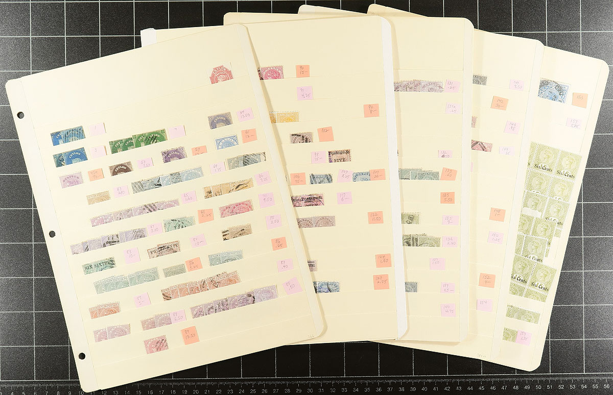 Part A: A mint and used accumulation of Queen Victoria issues on five manilla stockpages. With "Chalons", overprints and "Sidefaces". Generally, up to a dozen of a type, but with half a page of mint multiples of #159. Better singles includes #98, #106, #107, #110, #128, #139, #142, #153, #162-163. Overall condition is quite good, with only the occasional minor fault noted. Most items annotated with Scott numbers and (older) catalogue values. This is a collector’s duplicates, not a dealer’s stock, and has never been seen by the collecting community. Note: There are a few "Chalons" which appear to be imperforate, but are not and they were not considered in the estimated value. Estimate =