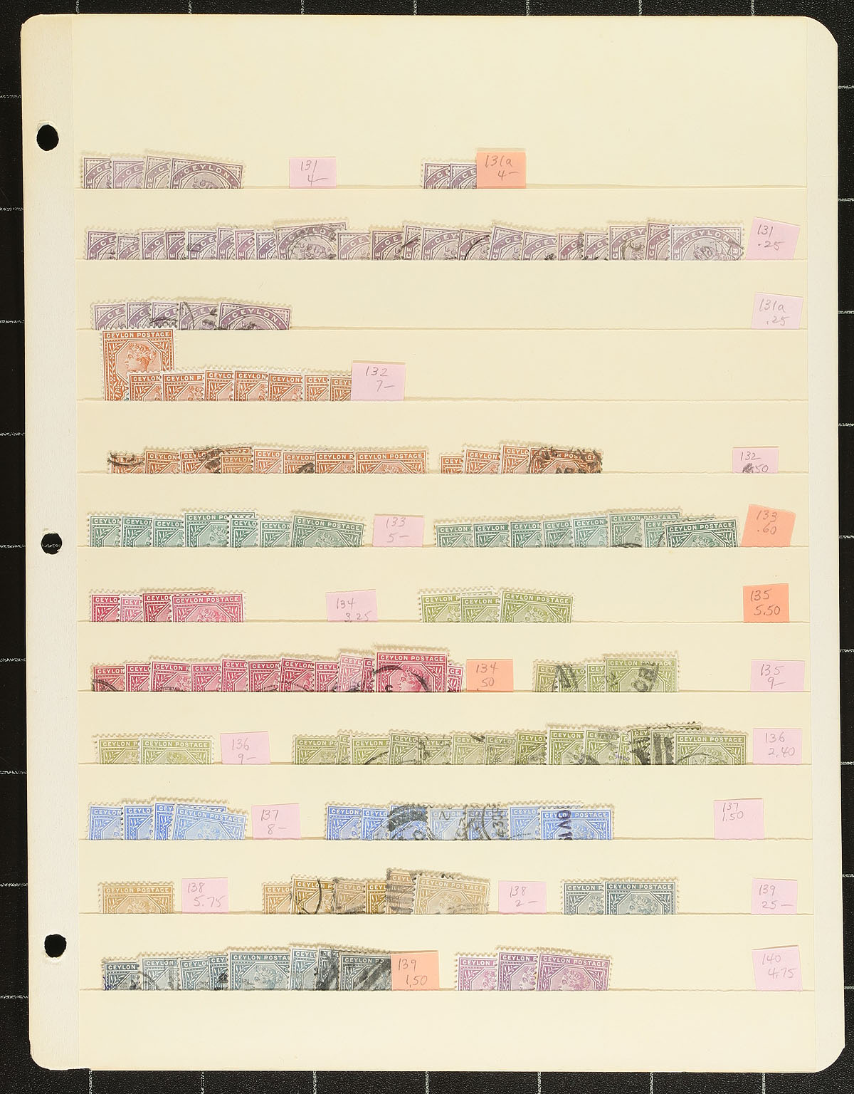 Part A: A mint and used accumulation of Queen Victoria issues on five manilla stockpages. With "Chalons", overprints and "Sidefaces". Generally, up to a dozen of a type, but with half a page of mint multiples of #159. Better singles includes #98, #106, #107, #110, #128, #139, #142, #153, #162-163. Overall condition is quite good, with only the occasional minor fault noted. Most items annotated with Scott numbers and (older) catalogue values. This is a collector’s duplicates, not a dealer’s stock, and has never been seen by the collecting community. Note: There are a few "Chalons" which appear to be imperforate, but are not and they were not considered in the estimated value. Estimate =