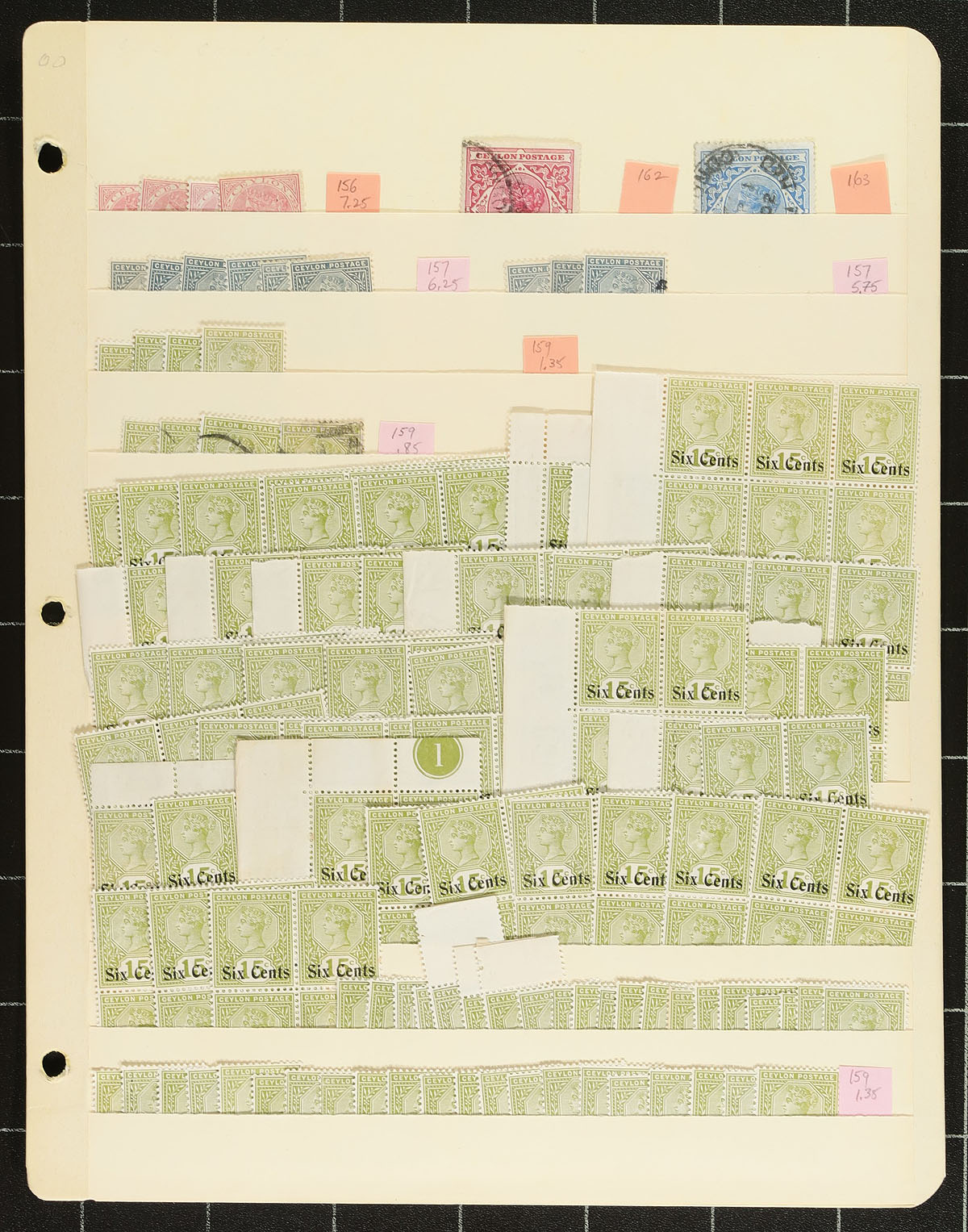 Part A: A mint and used accumulation of Queen Victoria issues on five manilla stockpages. With "Chalons", overprints and "Sidefaces". Generally, up to a dozen of a type, but with half a page of mint multiples of #159. Better singles includes #98, #106, #107, #110, #128, #139, #142, #153, #162-163. Overall condition is quite good, with only the occasional minor fault noted. Most items annotated with Scott numbers and (older) catalogue values. This is a collector’s duplicates, not a dealer’s stock, and has never been seen by the collecting community. Note: There are a few "Chalons" which appear to be imperforate, but are not and they were not considered in the estimated value. Estimate =