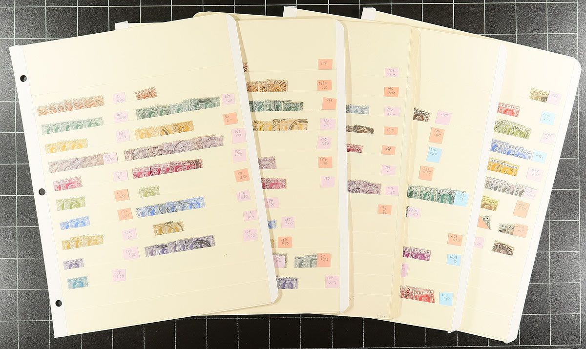 Part B: A mint and used accumulation of King Edward VII and King George V issues (to 1914) on five manilla stockpages. Both "Sideface" and "Keyplate" designs with values to 2R25. Generally, up to a dozen of a type. Better singles includes #194 (mint and used), #204a (x6 mint), #212 (3x used), #212a (2x used), #212b (mint and used). Overall the condition is quite good, with only the occasional minor fault noted, and some cancel potential may be lurking within. Most items annotated with Scott numbers and (older) catalogue values. This is a collector’s duplicates, not a dealer’s stock, and has never been seen by the collecting community. Estimate =