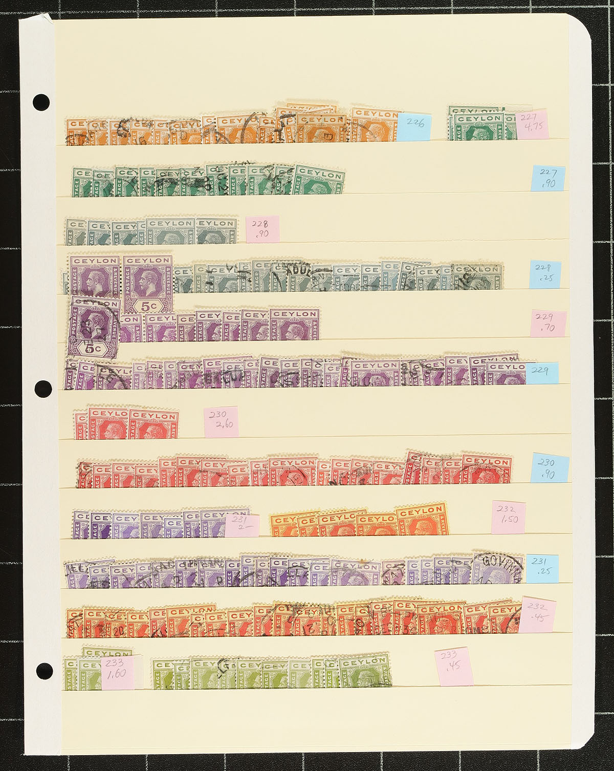 Part C: A mint and used accumulation of King George V issues (from 1921 to the 1935 Silver Jubilee set) on four manilla stockpages. Primarily "Keyplate" designs with values to 5R, including Scott-listed shades and die types. Generally, up to a dozen of a type. Better singles include mint and used examples of #214a, #235, #240a, #241a, 256a and a mint copy of #243, with the Silver Jubilee set having 4x mint and 5x used complete sets. Overall the condition is quite good, with only the occasional minor fault noted, and some cancel potential may be lurking within. Most items annotated with Scott numbers and (older) catalogue values. This is a collector’s duplicates, not a dealer’s stock, and has never been seen by the collecting community. Estimate =
