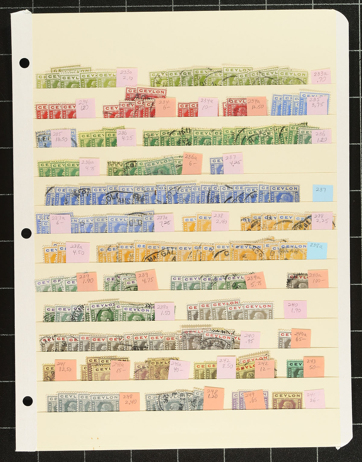 Part C: A mint and used accumulation of King George V issues (from 1921 to the 1935 Silver Jubilee set) on four manilla stockpages. Primarily "Keyplate" designs with values to 5R, including Scott-listed shades and die types. Generally, up to a dozen of a type. Better singles include mint and used examples of #214a, #235, #240a, #241a, 256a and a mint copy of #243, with the Silver Jubilee set having 4x mint and 5x used complete sets. Overall the condition is quite good, with only the occasional minor fault noted, and some cancel potential may be lurking within. Most items annotated with Scott numbers and (older) catalogue values. This is a collector’s duplicates, not a dealer’s stock, and has never been seen by the collecting community. Estimate =