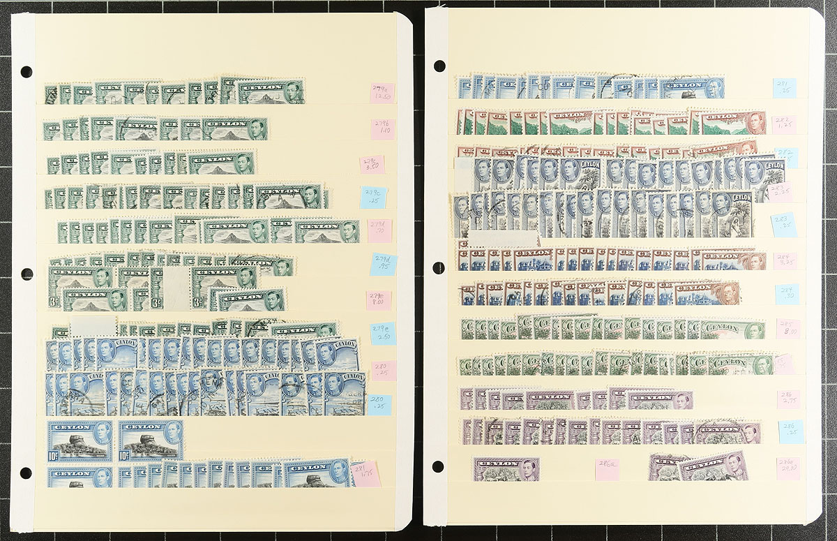 Part D: A mint and used accumulation of a short but important period in Ceylon’s philately, with the transition from King George V issues (1935-6 pictorials - noting #274 (5x mint, 9x used) and transitioning to King George VI. There are a dozen sets of the 1937 Coronation issue used. The technical King George VI pictorial issue which suffered from wartime production woes is well represented (noting: #279a, #285, #286a, #286b, multiples mint and used copies of #289 and#289A used. Generally, up to a dozen of a type. Overall condition is quite good, with only the occasional minor fault noted. Most items annotated with Scott numbers and (older) catalogue values. This is a collector’s duplicates, not a dealer’s stock, and has never been seen by the collecting community. Estimate =