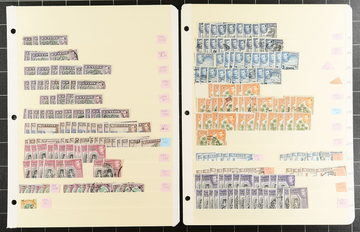 Part D: A mint and used accumulation of a short but important period in Ceylon’s philately, with the transition from King George V issues (1935-6 pictorials - noting #274 (5x mint, 9x used) and transitioning to King George VI. There are a dozen sets of the 1937 Coronation issue used. The technical King George VI pictorial issue which suffered from wartime production woes is well represented (noting: #279a, #285, #286a, #286b, multiples mint and used copies of #289 and#289A used. Generally, up to a dozen of a type. Overall condition is quite good, with only the occasional minor fault noted. Most items annotated with Scott numbers and (older) catalogue values. This is a collector’s duplicates, not a dealer’s stock, and has never been seen by the collecting community. Estimate =