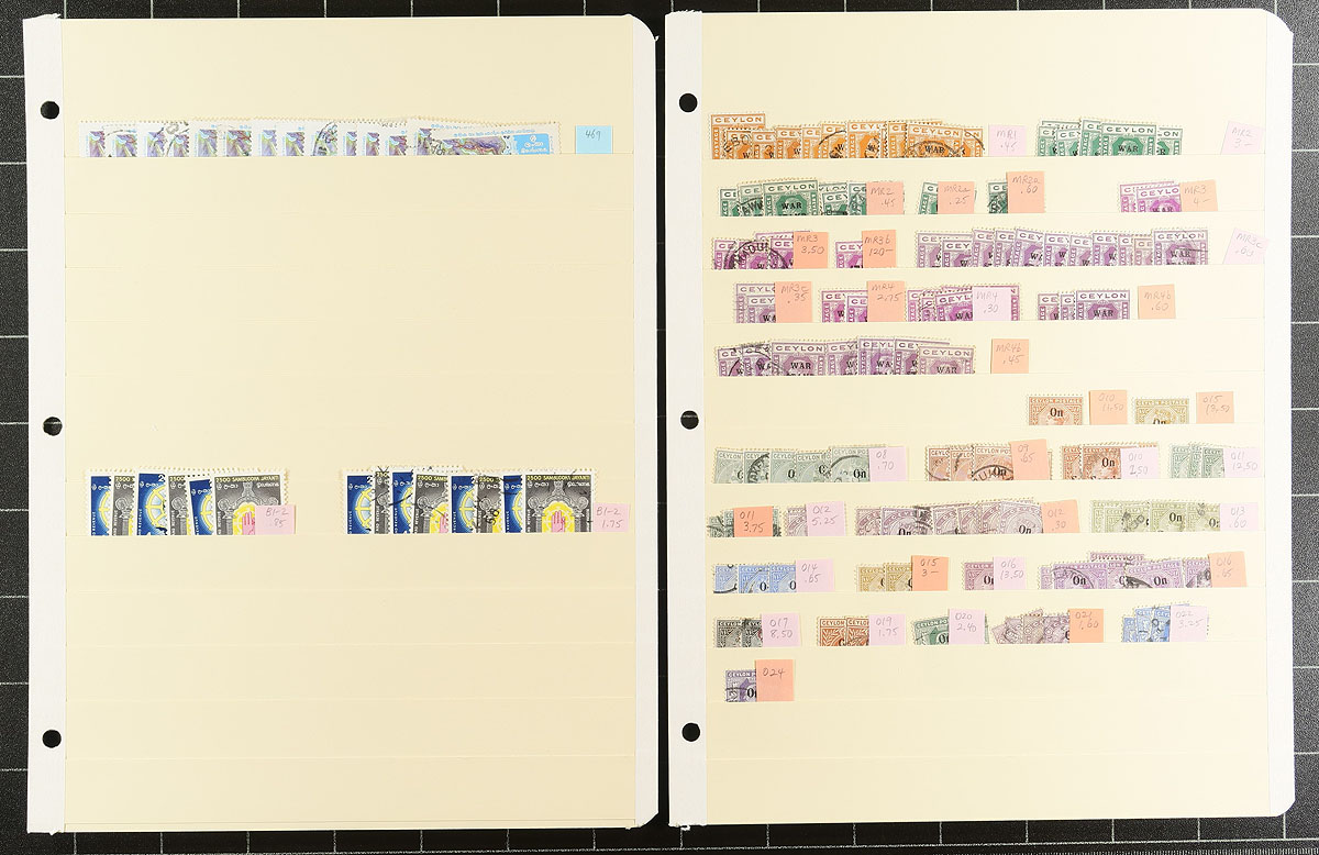 Part E: A mint and used accumulation covering the final period of British colonialism from the late King George VI period to the transition to becoming Sri Lanka (plus some back of the book). Decent coverage with up to a dozen of a type. Noted better such as two mint sets each of #319-328 and #346-356, plus extras such as #328 (1 mint, 2 used) and #356 (3x mint). Overall condition is quite good, with only the occasional minor fault noted. Most items annotated with Scott numbers and (older) catalogue values. All neatly organized on 14 manilla stockpages. This is a collector’s duplicates, not a dealer’s stock, and has never been seen by the collecting community. Estimate =