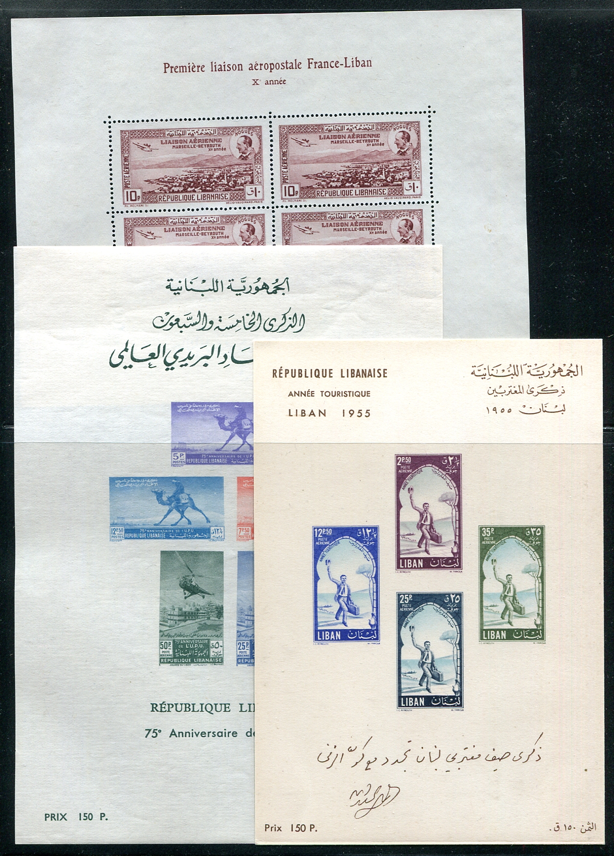 Up to 1961 Lebanon supplemented its airmail issues with souvenir sheets or cards, which make for eye-catching additions to your collection. Sometimes individually listed, sometimes as footnotes (with pricing) in Scott. These dozen sheetlets are never hinged except (C149a - couple bits of adhesion on the back) and C290a (signs of hinging). These oversized items are often subject to bending or damage, but these are in far above average condition. 2024 Scott US$453.10 =