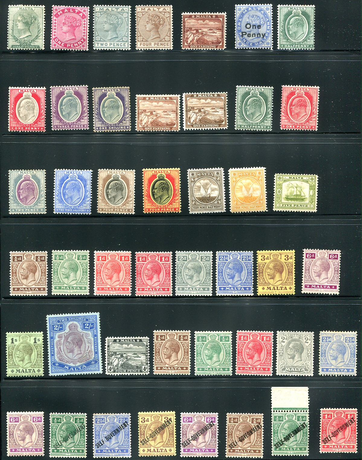 A selection of "Classic" Maltese stamps from the Victorian era to the mid-1920’s, including King Edward VII definitives, "Fishing Boats", "Self Government" overprints, and a nice selection of the "Malta statue" series, both with and without the "Postage" overprint, with values to 10/-. Better singles include #27, 42, 60, 91, 126. Appearance is quite good with only a couple of minor perf faults seen. The backs are varied, all are hinged, some have hinge remnants and a couple have pencil notations. 2024 Scott US$818.75 =