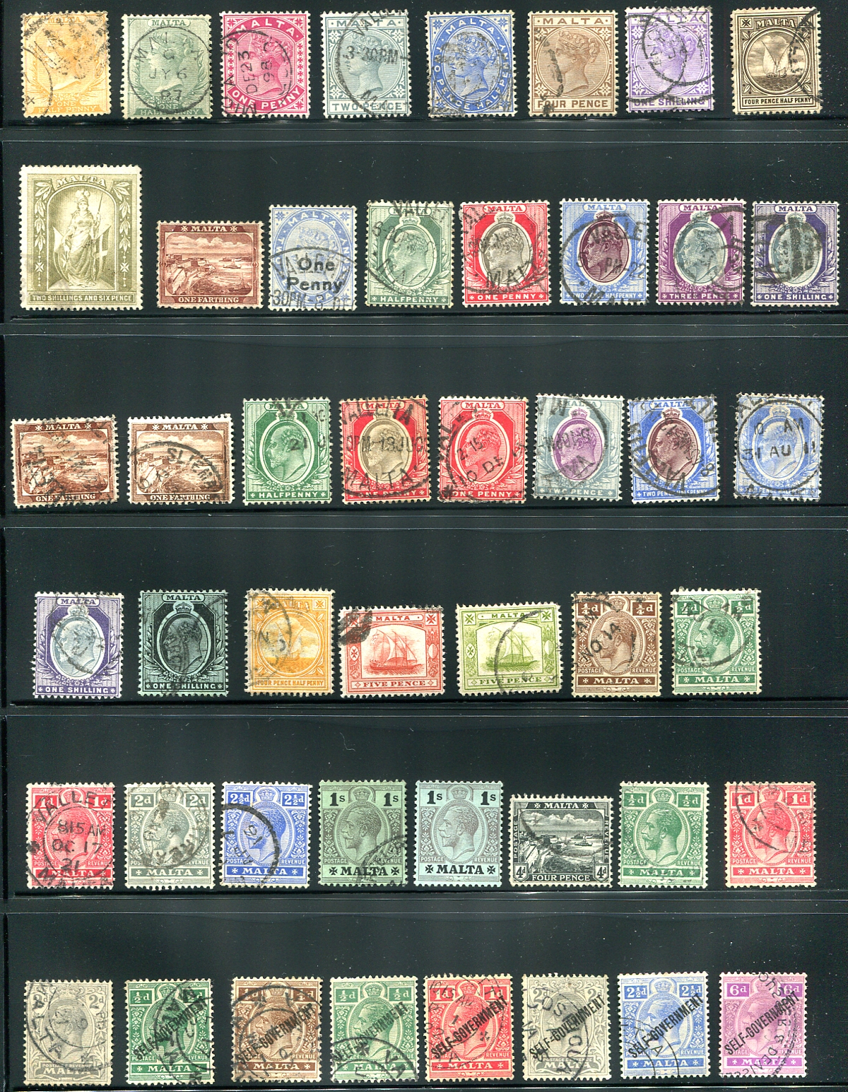 Two pages of all different used issues from the late Victorian period up to the 1935 Silver Jubilee set. Includes a nice copy of #57, a variety of KEVII, "Fishing Boats", "Valetta Harbour". The King George V includes better singles #59, 59a, 67, and "Self Government" overprints (#91), with a nice selection of "Malta Statue" issues to 10/- and the "Mdina" and "Neptune" higher values (#143, #145). Only a couple minor faults are to be expected, and there are lots of readable cancels. 2024 Scott US$705.85 =