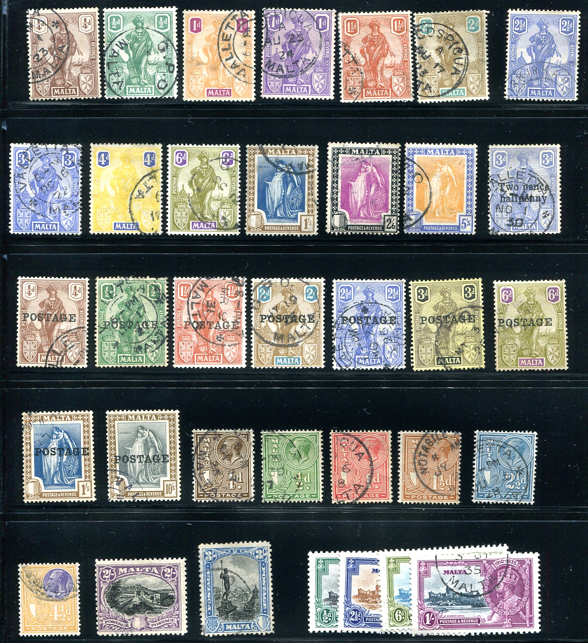 Two pages of all different used issues from the late Victorian period up to the 1935 Silver Jubilee set. Includes a nice copy of #57, a variety of KEVII, "Fishing Boats", "Valetta Harbour". The King George V includes better singles #59, 59a, 67, and "Self Government" overprints (#91), with a nice selection of "Malta Statue" issues to 10/- and the "Mdina" and "Neptune" higher values (#143, #145). Only a couple minor faults are to be expected, and there are lots of readable cancels. 2024 Scott US$705.85 =