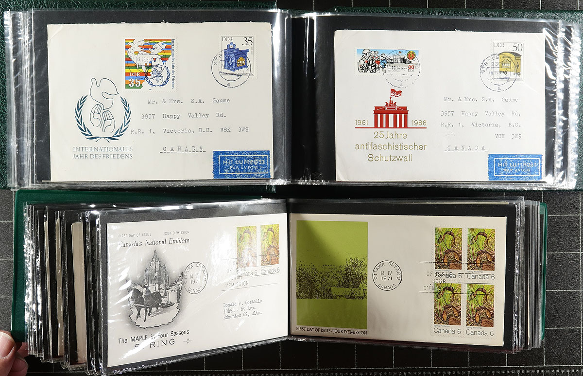 First Day Cover assortment, mostly 1960’s-1990’s. Lots of Fleetwood cachets including some Canada, Great Britain (larger covers 1988-1989), 1977 QEII Westminster Collector’s society (if you scoff at these, the album is great for re-use). There is four "Uni-Safe" FDC albums (albums alone retail over $100.00), two with German Democratic Republic (many look to be postally used FDCs), one Canada/United Nations and the last with an assortment of worldwide. There are a couple of other issues in folders, and a good handful of loose FDCs (noted worldwide covers honouring the 1980 Moscow Olympics). A couple might be regular mail or first flight covers, but this is a small percentage of the approximately 500 items here. Estimate =