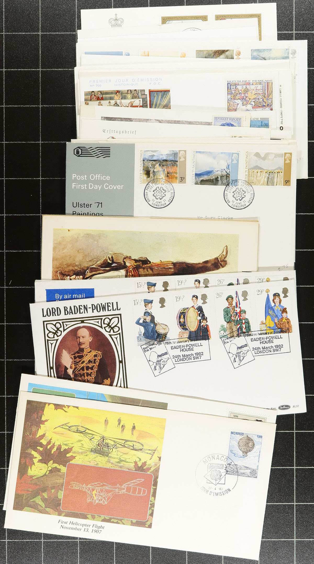 First Day Cover assortment, mostly 1960’s-1990’s. Lots of Fleetwood cachets including some Canada, Great Britain (larger covers 1988-1989), 1977 QEII Westminster Collector’s society (if you scoff at these, the album is great for re-use). There is four "Uni-Safe" FDC albums (albums alone retail over $100.00), two with German Democratic Republic (many look to be postally used FDCs), one Canada/United Nations and the last with an assortment of worldwide. There are a couple of other issues in folders, and a good handful of loose FDCs (noted worldwide covers honouring the 1980 Moscow Olympics). A couple might be regular mail or first flight covers, but this is a small percentage of the approximately 500 items here. Estimate =