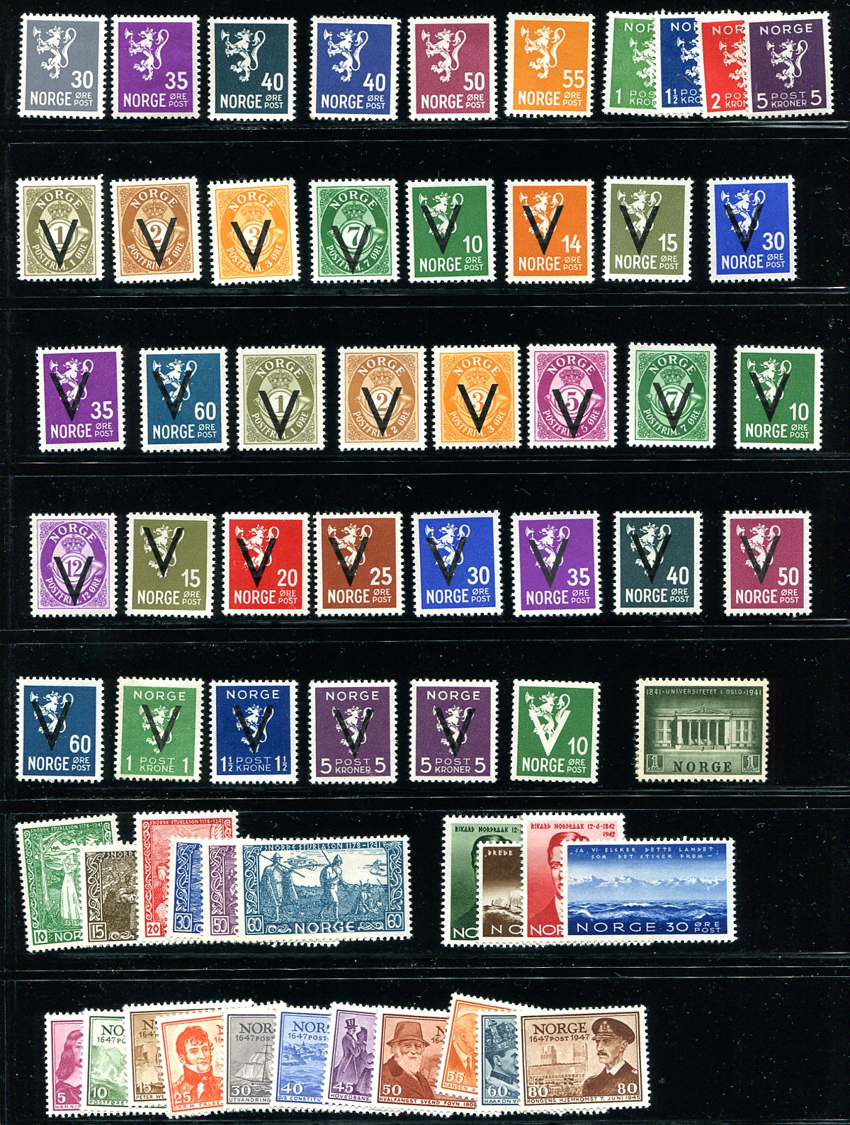 A mint offering with a range of "Post Horn" printings, the Amundsen polar flight issue, a range of sets in the inter-war period, most of the "V" overprints, the 1941 University of Oslo stamp and going up to the 1947 Norwegian Post Office anniversary set. Most are mint, Hinged, but a few are never hinged. Great appearance, and few faults were seen, making for a very clean couple of pages. 2024 Scott US$347.30 =
