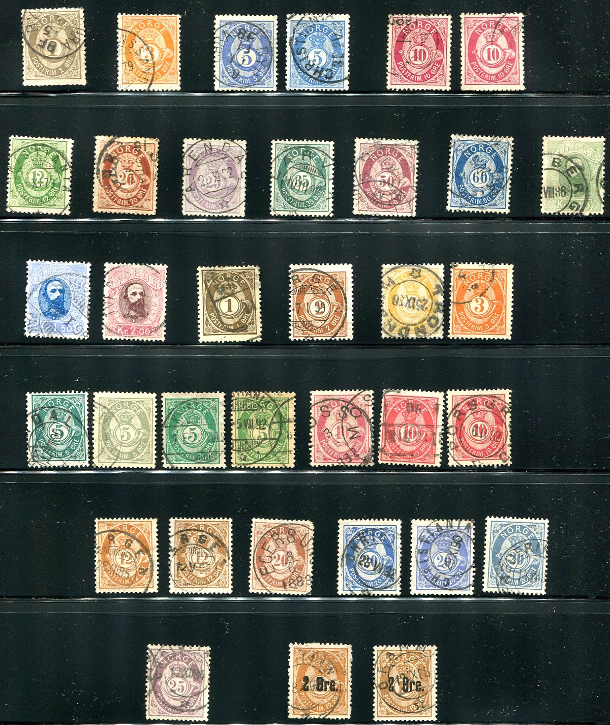 A page of used "Ore" era "Post-Horn" designs, with a couple depicting King Oscar II. A very complete group from the first two 19th century issues, with better such as #28 and includes a number of Scott-listed colour shades. Check out some of those terrific cancels! Solid condition throughout, with only a couple of minor faults. 2024 Scott US$709.00 =