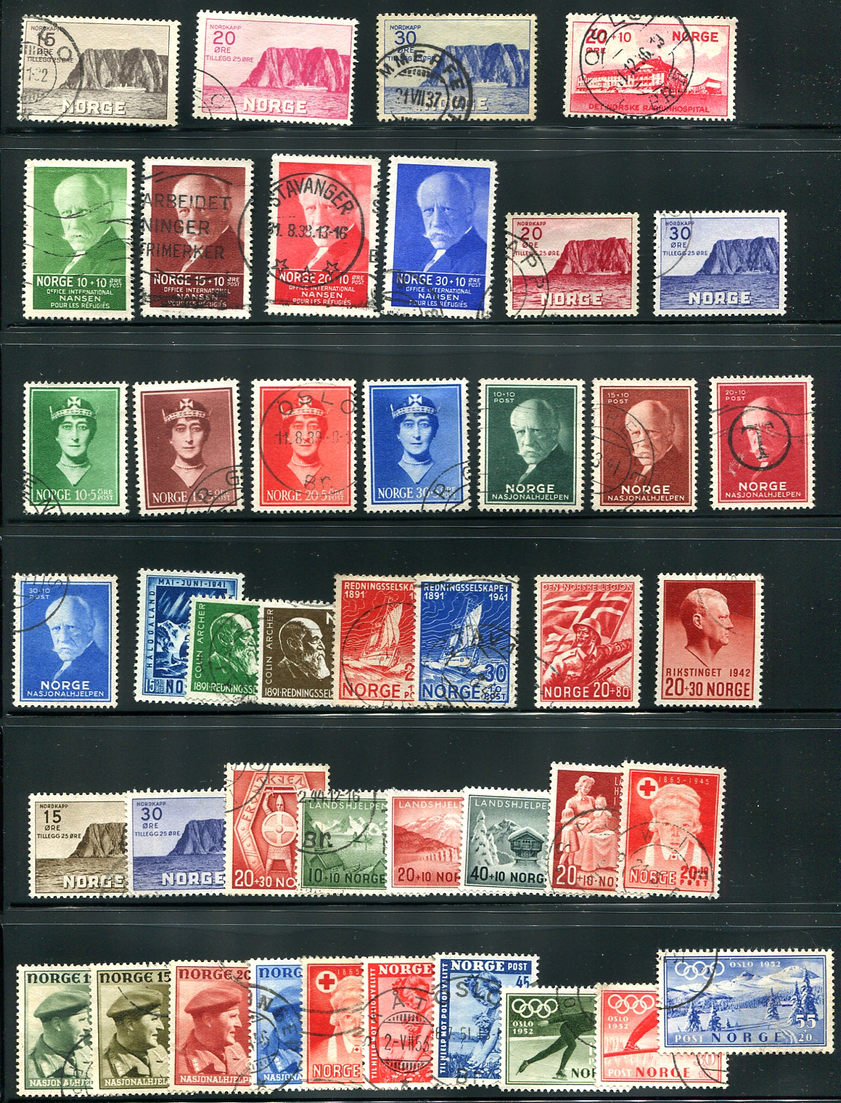 Norwegian "back of the book" used selection, strong in semi-postals (which are much harder to find used than mint), including a good range of "North Cape" designs (#B3) and the Norwegian foreign legion fundraiser (#B24). There is a quartet of airmails and a complete basic set of postage dues with an extra shade of the 10 ore (#J3a). Excellent condition and a few have very nice cancels. 2024 Scott US$666.30 =