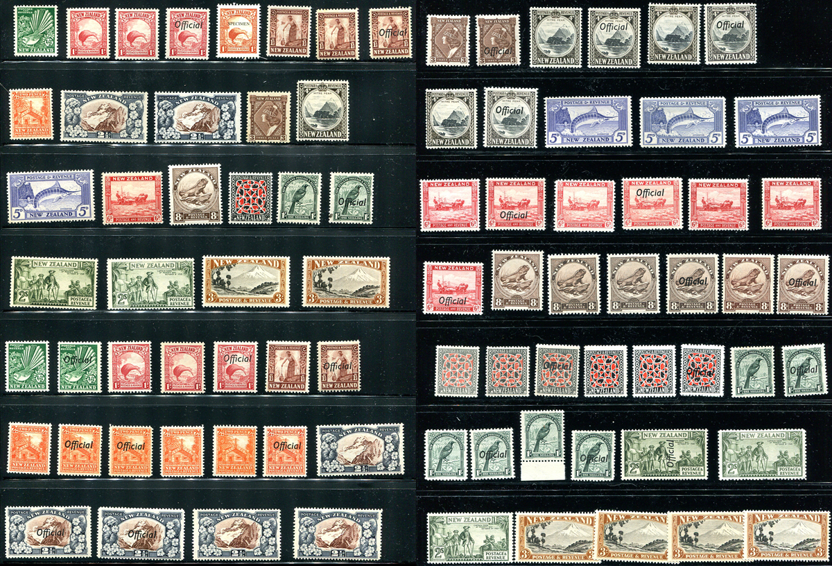 Over seventy different variants from the popular 1935 definitives, including different watermarks, perforations, papers and some with "Official" overprints. All cleanly mint, Hinged. With an ordered list of the different printings catalogued by both Campbell Paterson (taking the lowest priced colour shade) and Scott. There are a couple of bonus 1d "Kiwis", one a shade, the other a modern "Specimen" overprint from a souvenir sheet. A great way to expand your knowledge of this technical series. Campbell Paterson 2020 catalogue value NZ$2120.00 ($1738.40 CDN). Also catalogued as the basic items in Scott Catalogue. 2024 Scott US$931.10 =