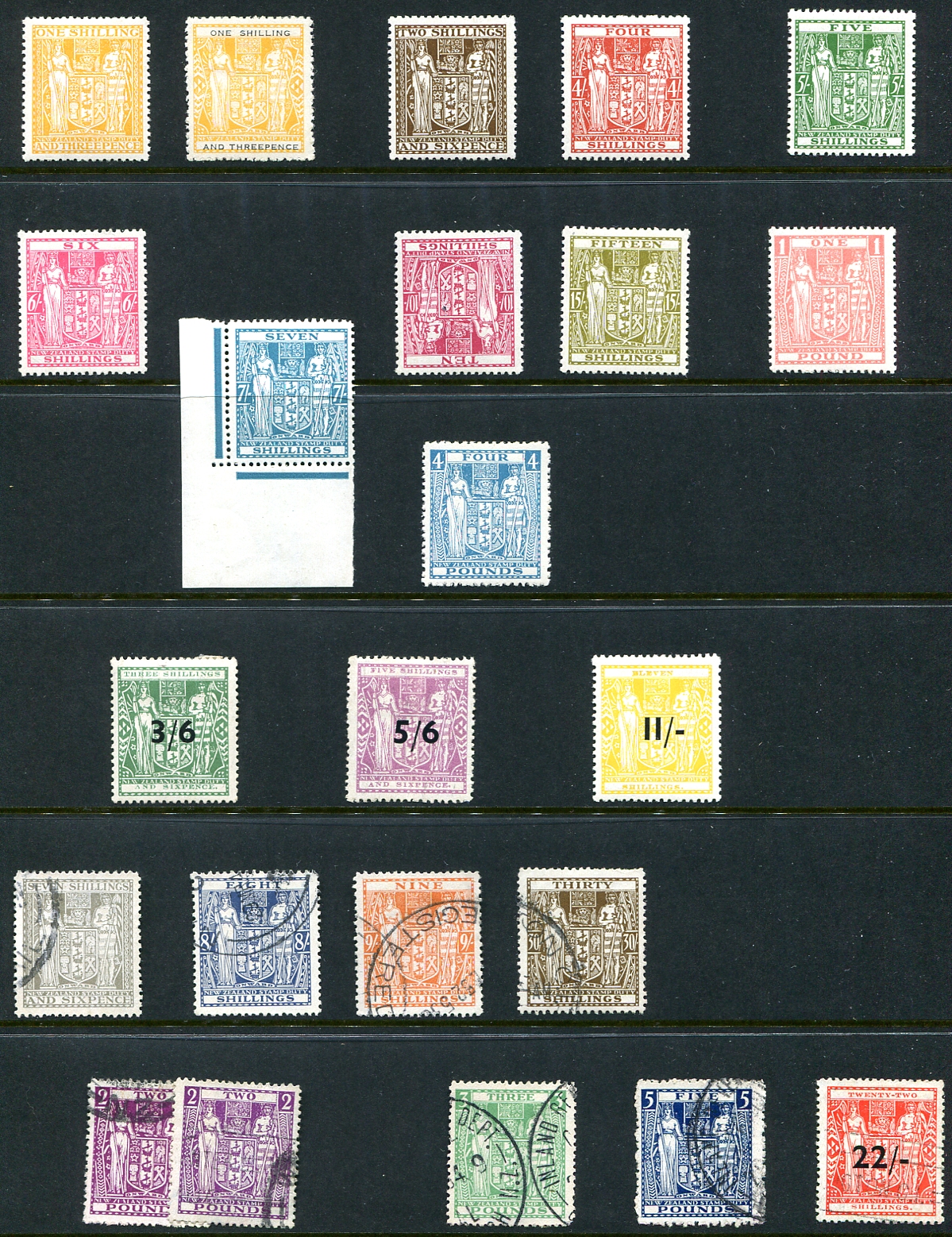 A mix of mint and used "Arms" postal fiscals from the second series, with assorted mint values from 1/3 to £4 and three overprints (the mint 10/- has a dark spot and is not counted in the $409.75 catalogue value). There is a group of used examples with the good 7/6, 12/6 and the 22/- on 22/- (the £3 and £5 stamps have revenue cancels and are not counted in the $720.00 catalogue value). Total 2024 Scott US$1129.75 =
