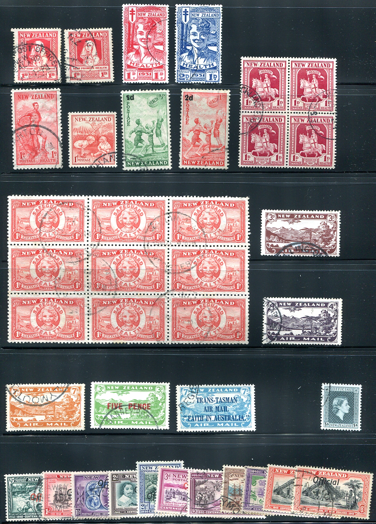 An appealing page of used "Back of the Book" with some early "Health" semi-postals including the "Nurses" and "Smiling Boy" duos, a block of the "Crusader" and a block of nine of the "Lifesaver". The first five air mails are here, as is the 1940 Centennial set overprinted "Official" and the 3/- Queen Elizabeth II high value. All nicely used with clean cancels. 2024 Scott US$618.75 =