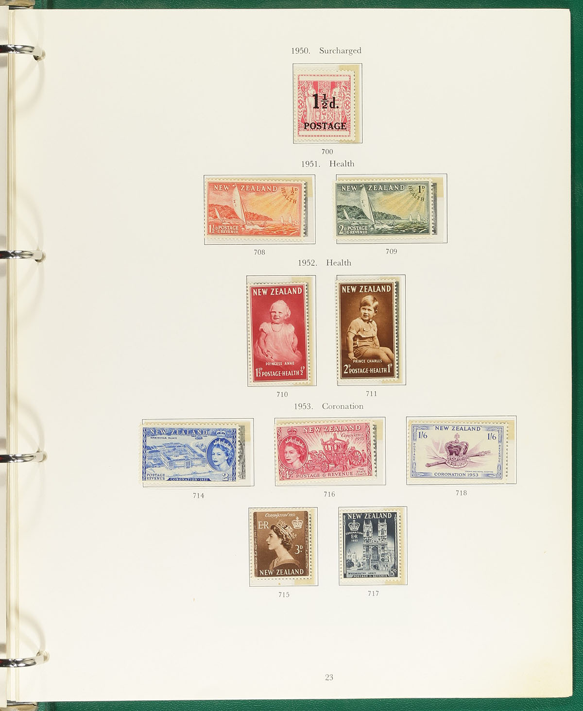 Two Stanley Gibbons album collection with the remnants of an estate. Some has been removed, but there is still lots of meat on these bones. Noted the 1874 issued 5/- high value (#60 - cat $500.00), a mint block of the 1d "Victoria Land" (#131D - cat $300.00), the overprint on the QEII "Stars" definitive (#320 - cat $170.00), plus the pictorial issues in both sterling and decimal currency. The "back of the book" is represented with lots of "Health" souvenir sheets and airmails #C1-C5. And much more, both mint and used! Includes cancels, fiscals, blocks, minor varieties, etc. The pages go up to 1989, but there are no stamps after 1979. Significant value here. Estimate =