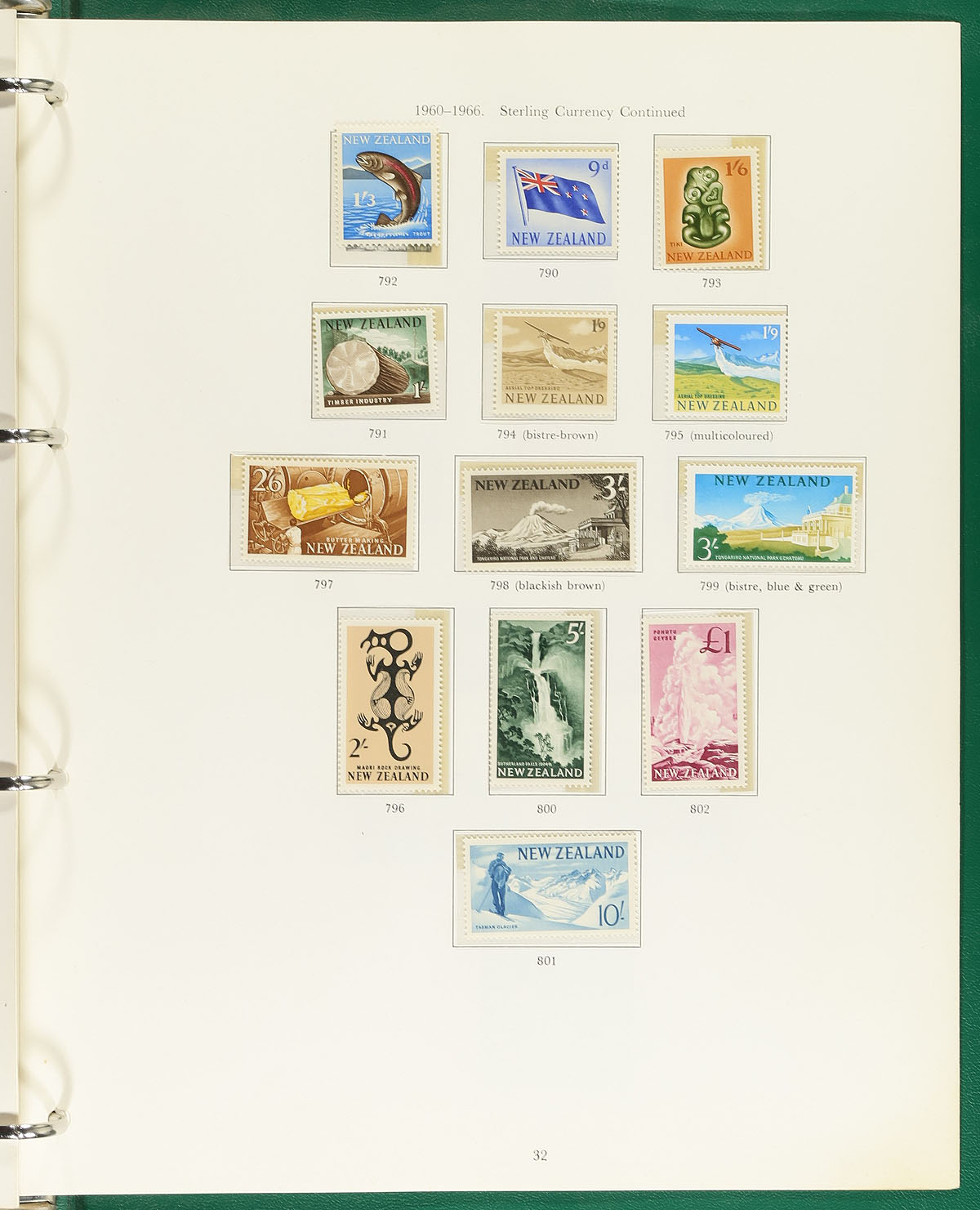 Two Stanley Gibbons album collection with the remnants of an estate. Some has been removed, but there is still lots of meat on these bones. Noted the 1874 issued 5/- high value (#60 - cat $500.00), a mint block of the 1d "Victoria Land" (#131D - cat $300.00), the overprint on the QEII "Stars" definitive (#320 - cat $170.00), plus the pictorial issues in both sterling and decimal currency. The "back of the book" is represented with lots of "Health" souvenir sheets and airmails #C1-C5. And much more, both mint and used! Includes cancels, fiscals, blocks, minor varieties, etc. The pages go up to 1989, but there are no stamps after 1979. Significant value here. Estimate =