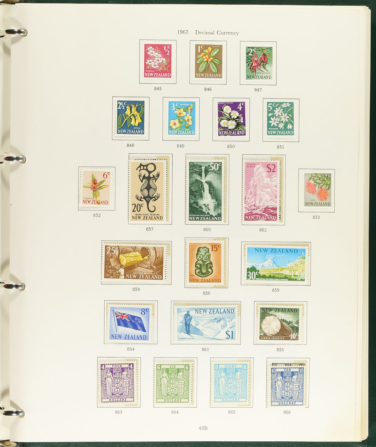 Two Stanley Gibbons album collection with the remnants of an estate. Some has been removed, but there is still lots of meat on these bones. Noted the 1874 issued 5/- high value (#60 - cat $500.00), a mint block of the 1d "Victoria Land" (#131D - cat $300.00), the overprint on the QEII "Stars" definitive (#320 - cat $170.00), plus the pictorial issues in both sterling and decimal currency. The "back of the book" is represented with lots of "Health" souvenir sheets and airmails #C1-C5. And much more, both mint and used! Includes cancels, fiscals, blocks, minor varieties, etc. The pages go up to 1989, but there are no stamps after 1979. Significant value here. Estimate =