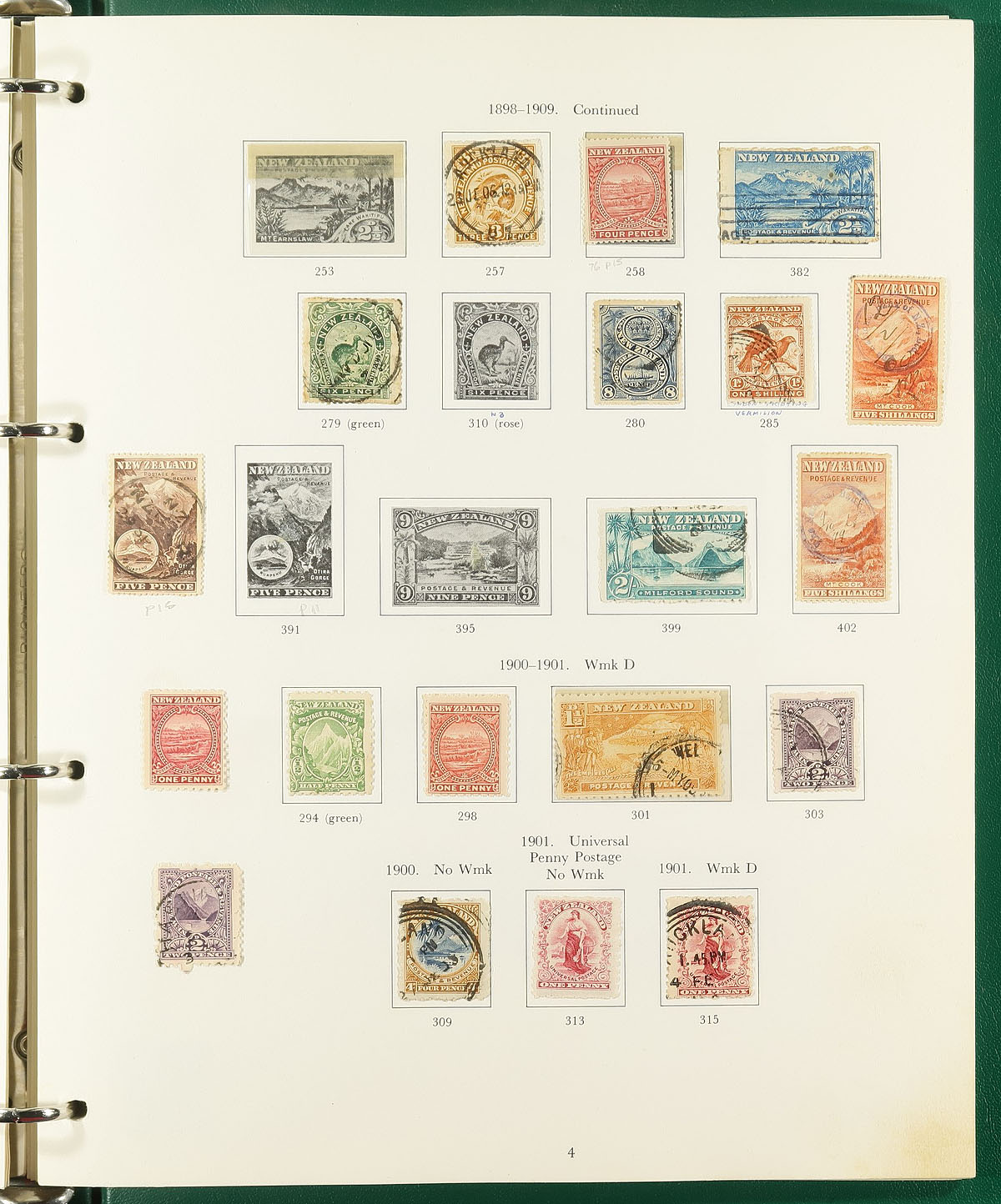 Two Stanley Gibbons album collection with the remnants of an estate. Some has been removed, but there is still lots of meat on these bones. Noted the 1874 issued 5/- high value (#60 - cat $500.00), a mint block of the 1d "Victoria Land" (#131D - cat $300.00), the overprint on the QEII "Stars" definitive (#320 - cat $170.00), plus the pictorial issues in both sterling and decimal currency. The "back of the book" is represented with lots of "Health" souvenir sheets and airmails #C1-C5. And much more, both mint and used! Includes cancels, fiscals, blocks, minor varieties, etc. The pages go up to 1989, but there are no stamps after 1979. Significant value here. Estimate =