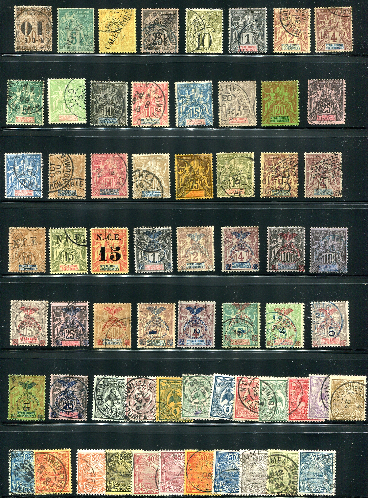 A page of early, used, French Pacific colonial issues, with some beautiful cancels here. Includes a few French Colony issues with overprints and revaluations, moving into the popular "Navigation and Commerce" set, including #54 and then much of the set with "Jubilee" overprints and various other revaluations. Finishes with much of the first set with local themes. Only a couple of small faults noted. 2024 Scott US$460.35 =