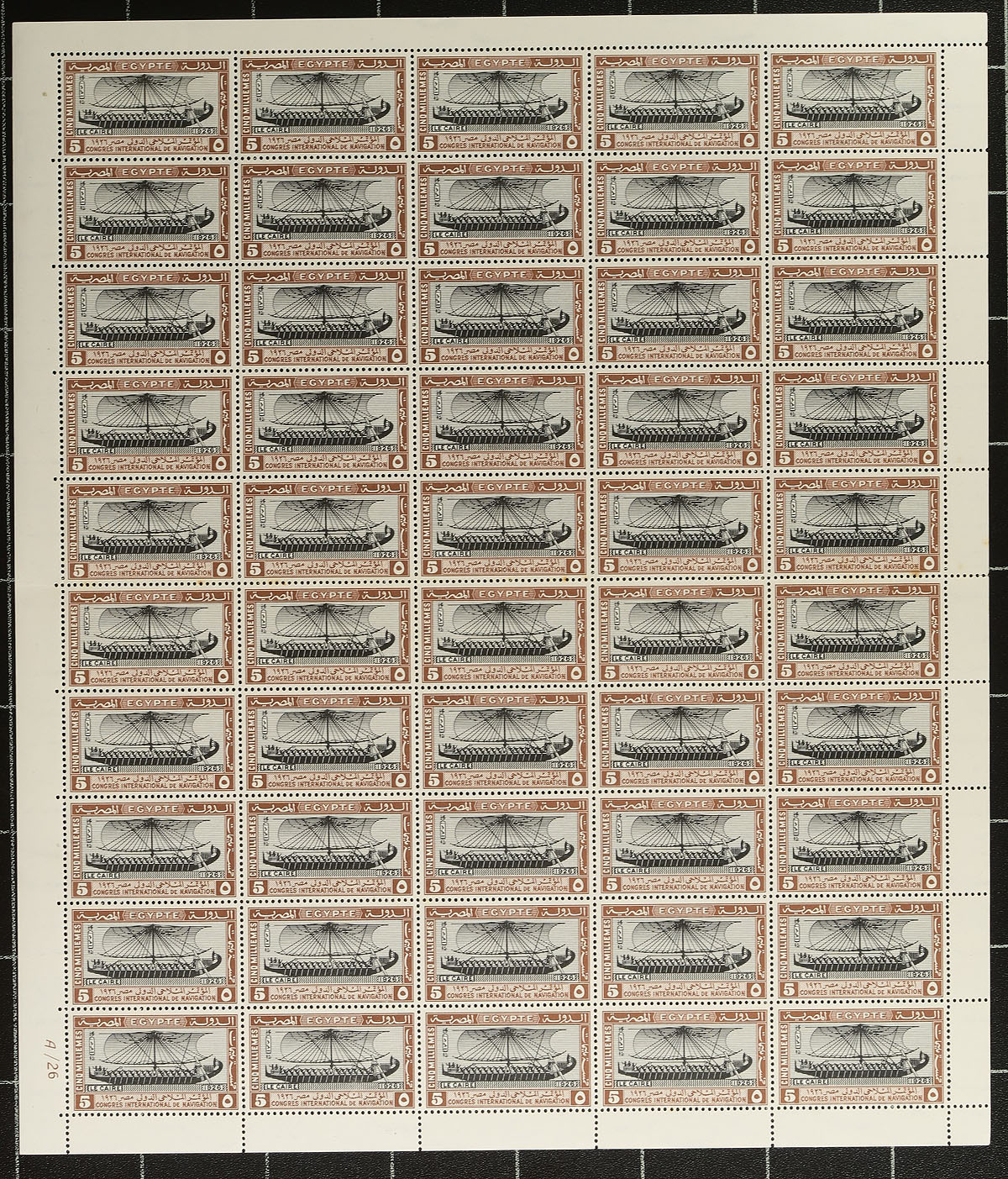 Complete set of the 1926 International Navigation Congress of Cairo trio showing the "Ship of Hatshepsut" in complete mint never hinged sheets of 50! Showpieces approaching their 100th birthday! Expect a couple of minor faults, otherwise very attractive! 2024 Scott US$525.00 =
