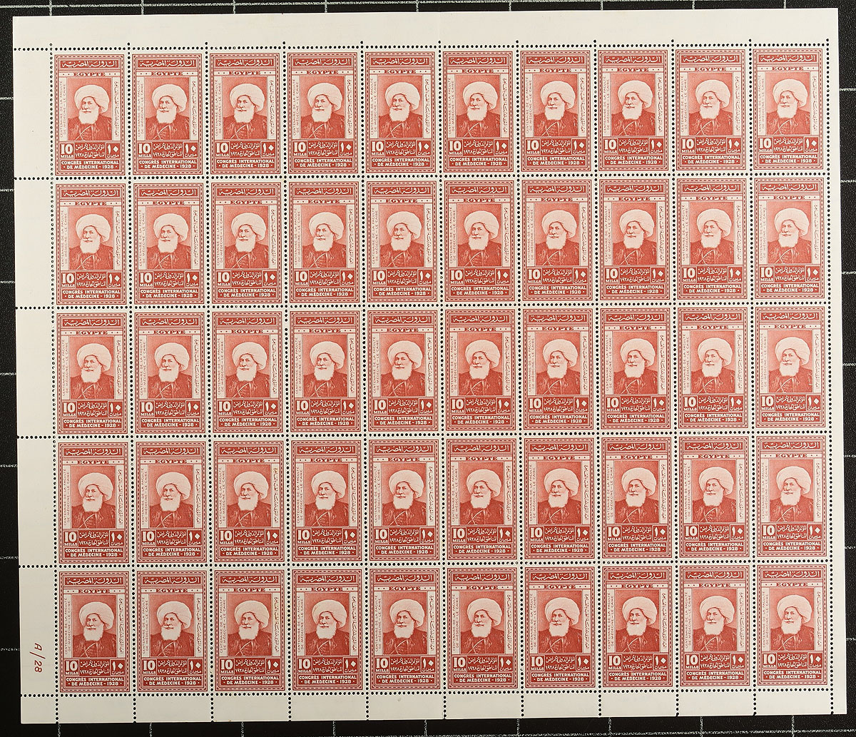 Two sets, the 1927 International Cotton Congress trio plus the 1928 International Congress of Medicine duo, both held in Cairo. Each in a complete mint, never hinged, sheet of 50! A couple of imperfections are to be expected, but otherwise this is a fine, rarely seen offering. 2024 Scott US$517.50 =