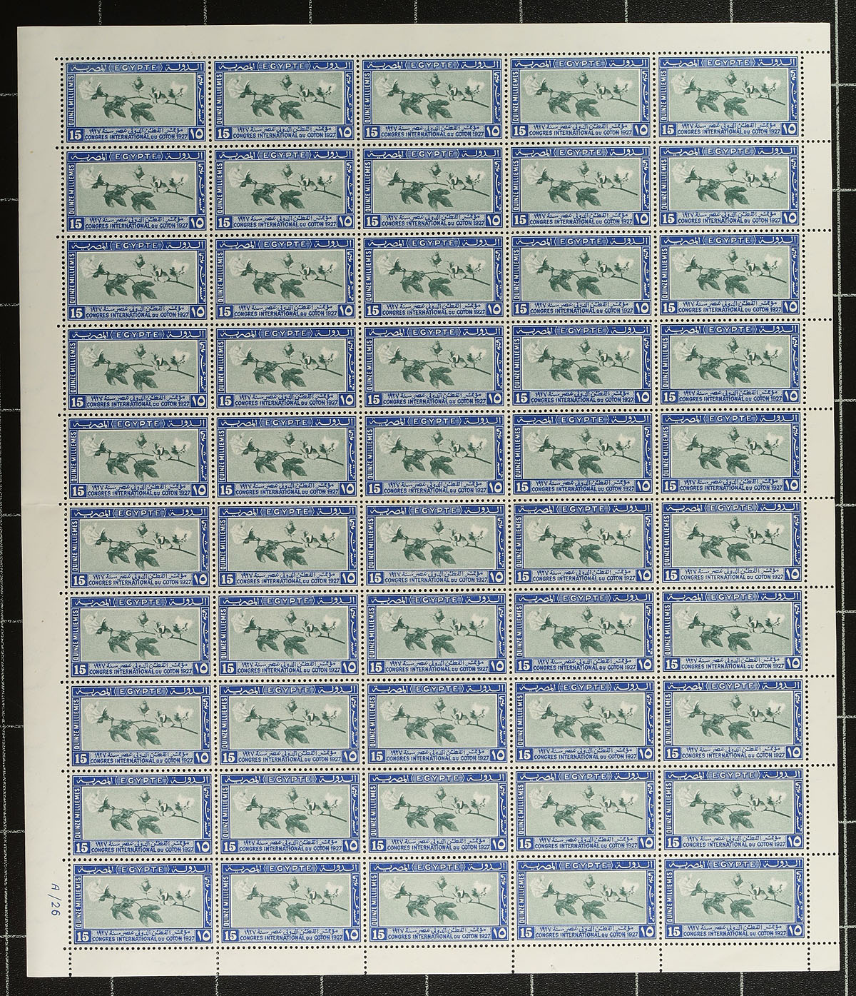 Two sets, the 1927 International Cotton Congress trio plus the 1928 International Congress of Medicine duo, both held in Cairo. Each in a complete mint, never hinged, sheet of 50! A couple of imperfections are to be expected, but otherwise this is a fine, rarely seen offering. 2024 Scott US$517.50 =